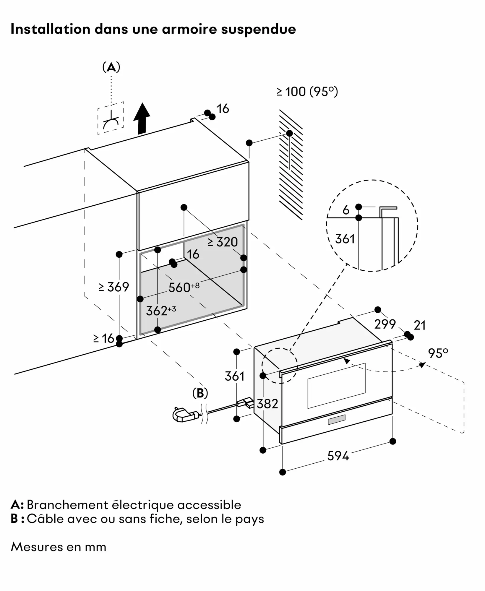 Installation au-dessus d'un four avec un plancher intermédiaire standard ou la tablette intermédiaire réglable GA 601 010.