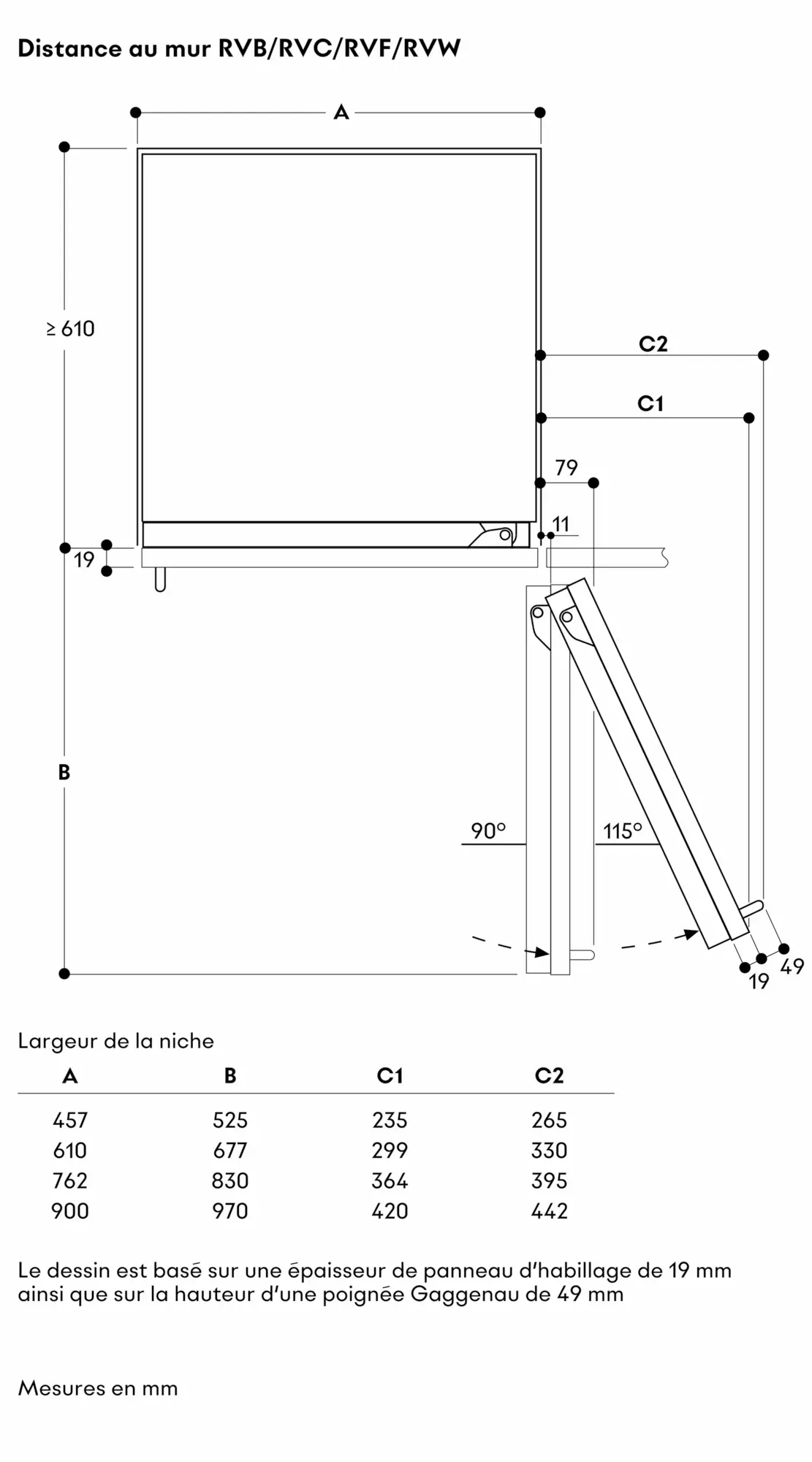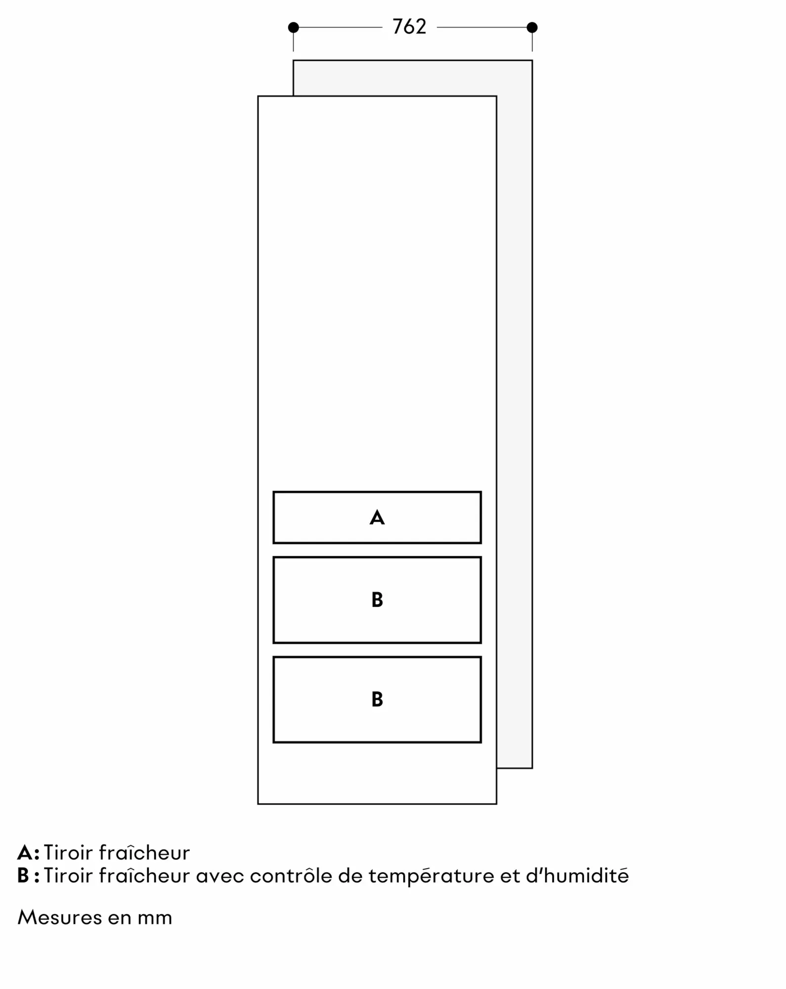 Les tiroirs de RVC et de RVF sont situés à la même hauteur. Dans le cas d’une installation côte à côte, les surfaces de stationnement et les appuis de porte peuvent être alignés sur les mêmes niveaux.