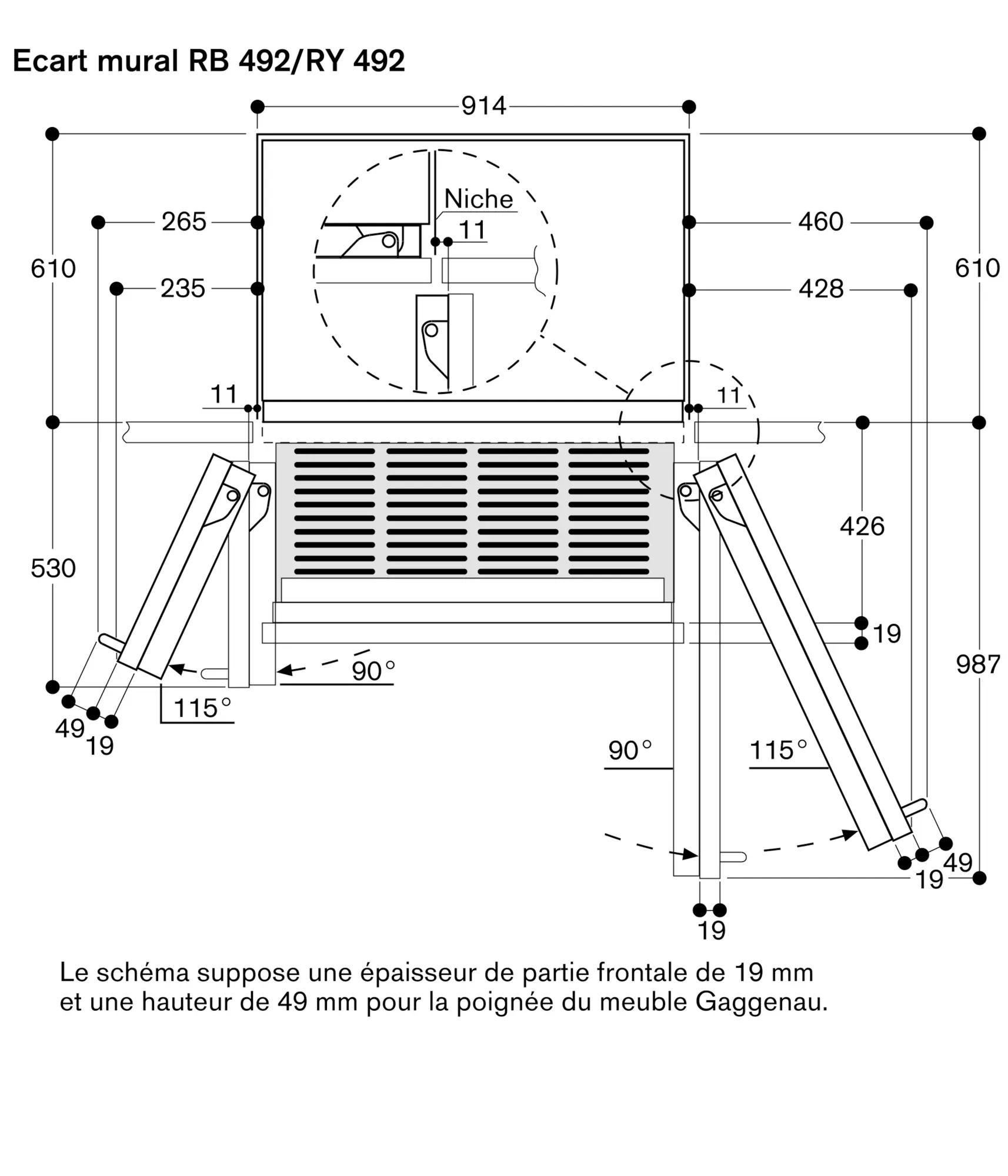 Ouverture de la porte jusqu'à 115° fixable à 90°
