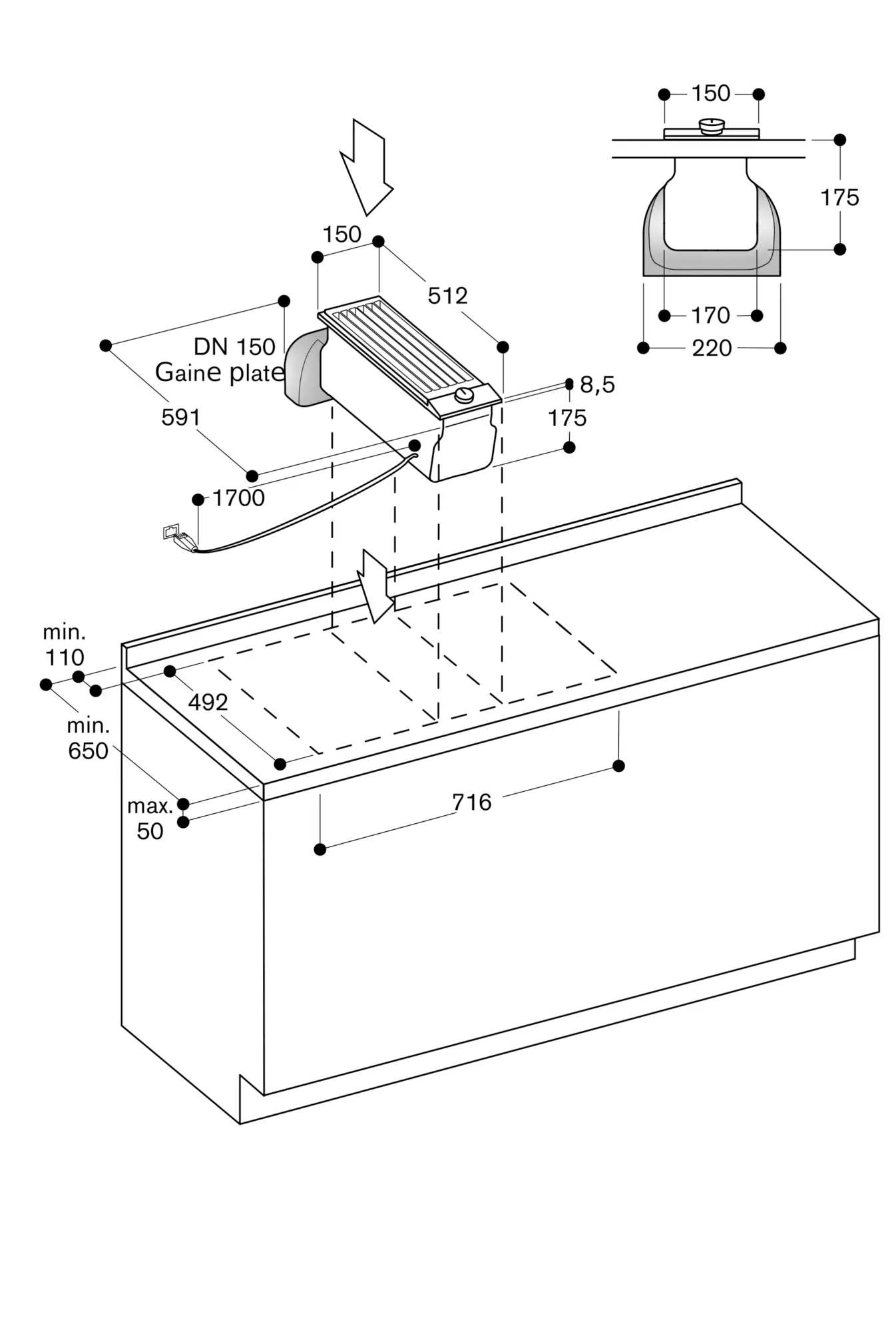 La largeur du plan de cuisson entre deux VL doit être max. 60 cm.
