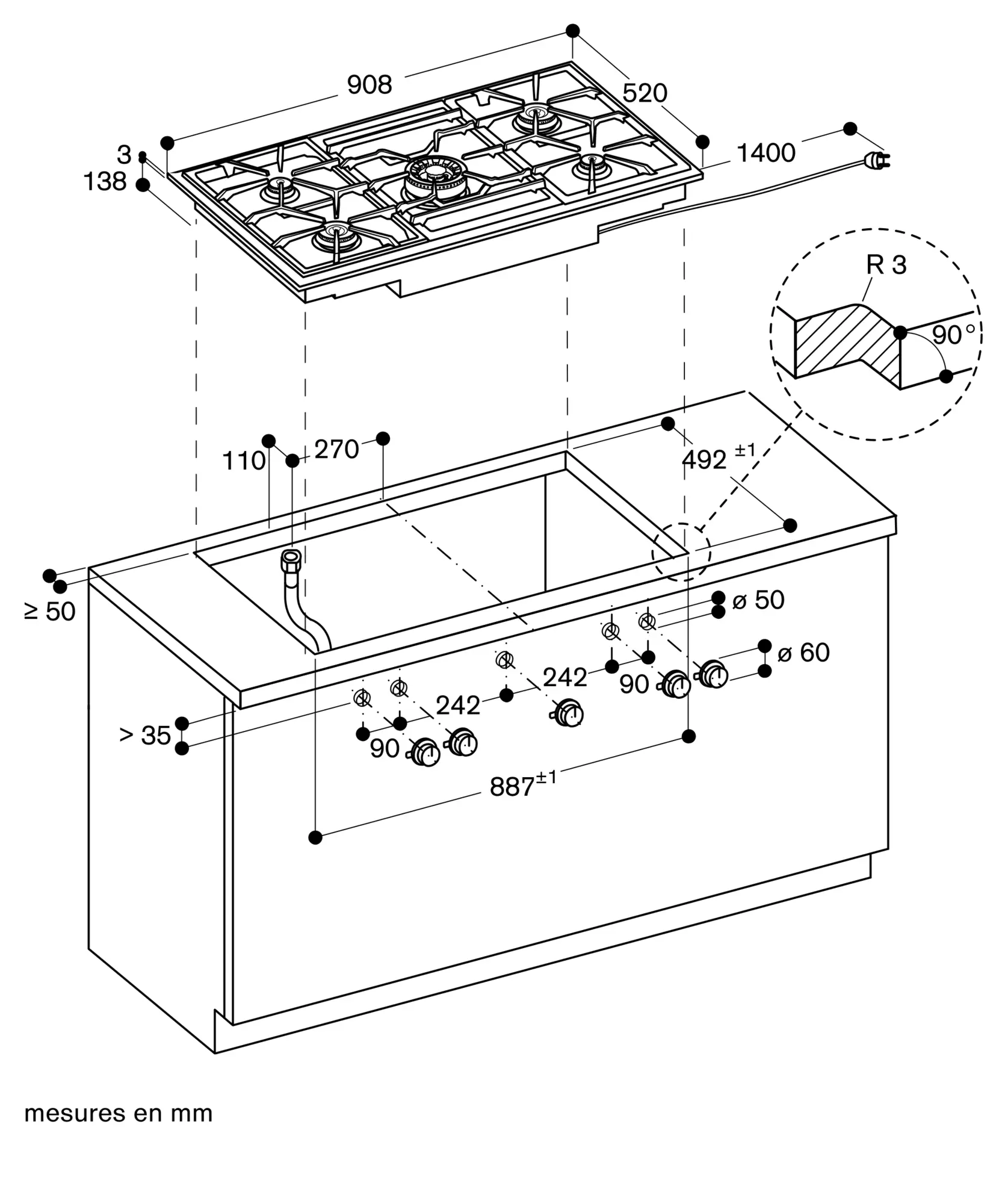 Selon le type d'encastrement et de configuration (en relief ou à fleur de plan, avec ou sans couvercle), faire attention aux dimensions et caractéristiques spécifiques de la découpe et des boutons de commande.