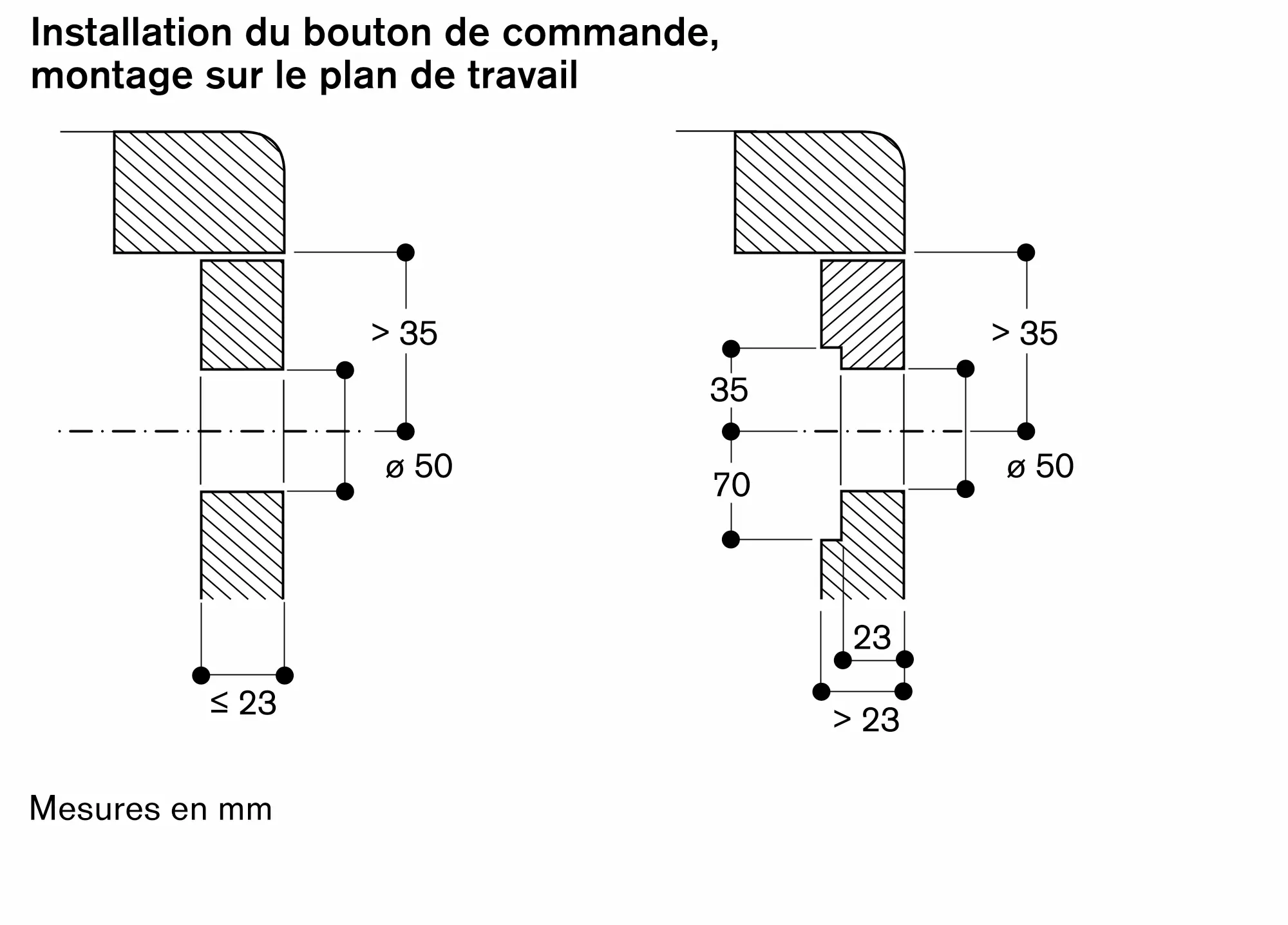 Selon le type d'installation (sur le plan avec cadre apparent ou à fleur de plan), l'emplacement de la découpe du plan de travail et le positionnement du bouton de commande peuvent varier.