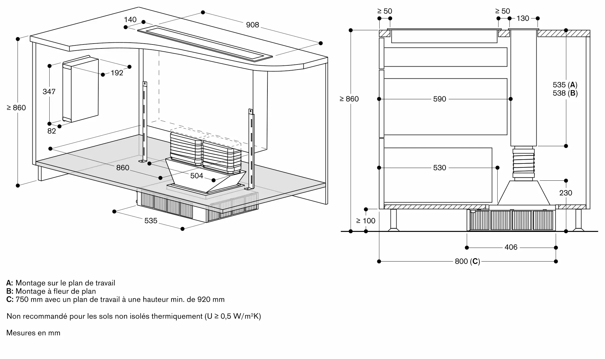 La hotte de plan de travail doit être installée dans une découpe séparée dans le plan de travail.