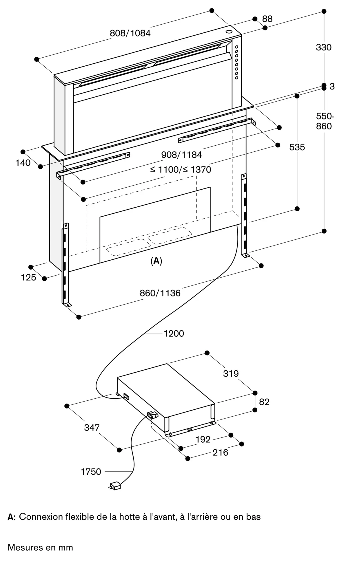 Flexibilité des possibilités de connexion au caisson moteur séparé : en bas, à l'avant ou à l'arrière.Toutes ces options de connexion permettent l'installation de tiroirs à l'avant de la hotte de plan de travail.