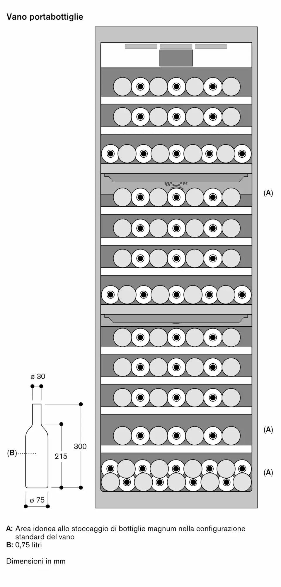 Con i raccordi standard (12 scaffali) possono essere conservati fino a 12 bottiglie di magnum.