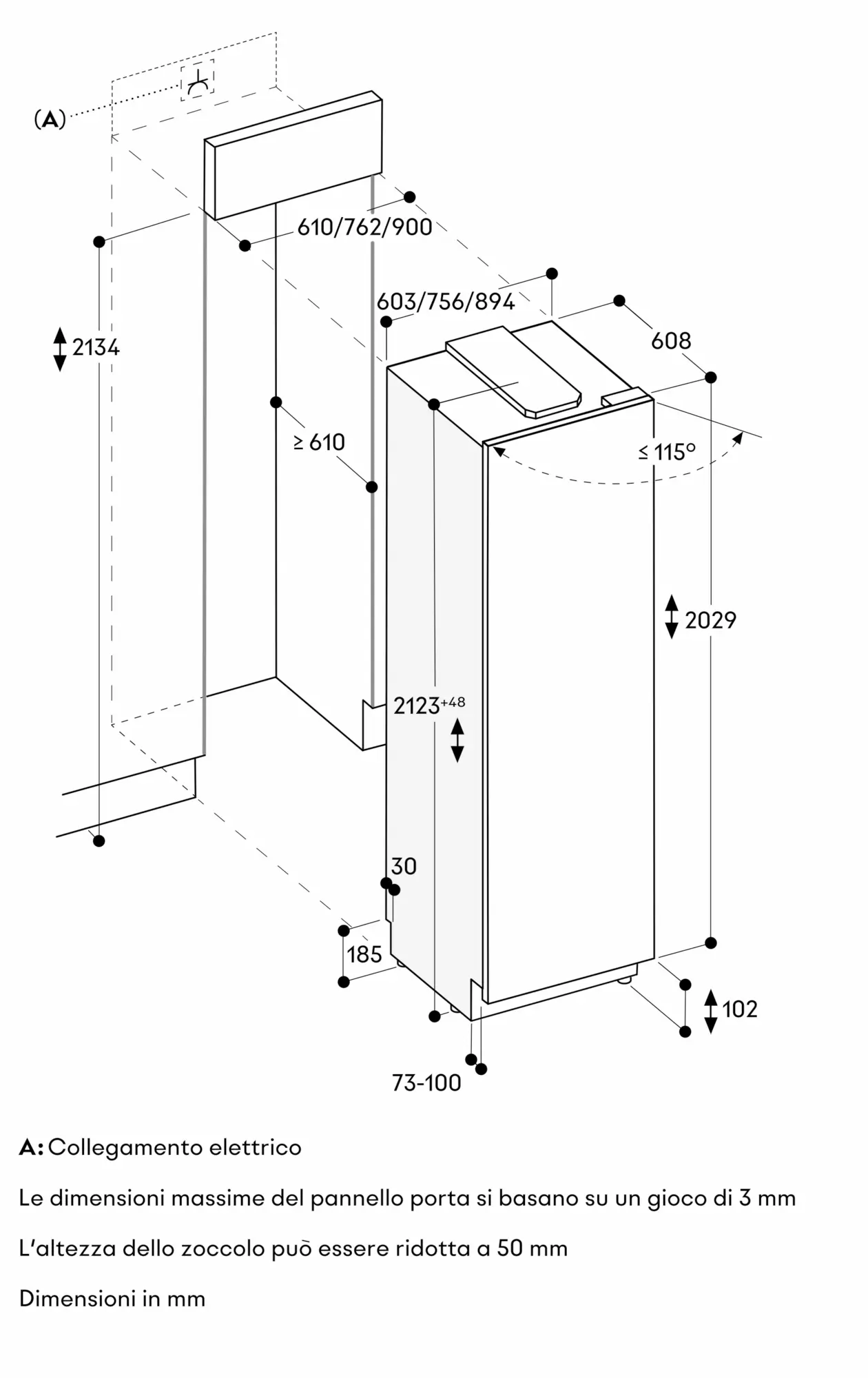 Angolo di apertura della porta di 115°, possibilità di bloccaggio a 90 °.