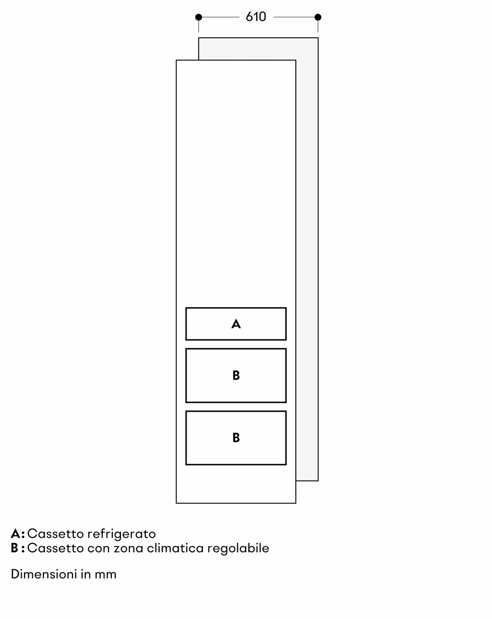 I cassetti di RVC e RVF sono alla stessa altezza. Nel caso di un'installazione side-by-side, i ripiani di appoggio e i ripiani delle porte possono essere allineati sugli stessi livelli.