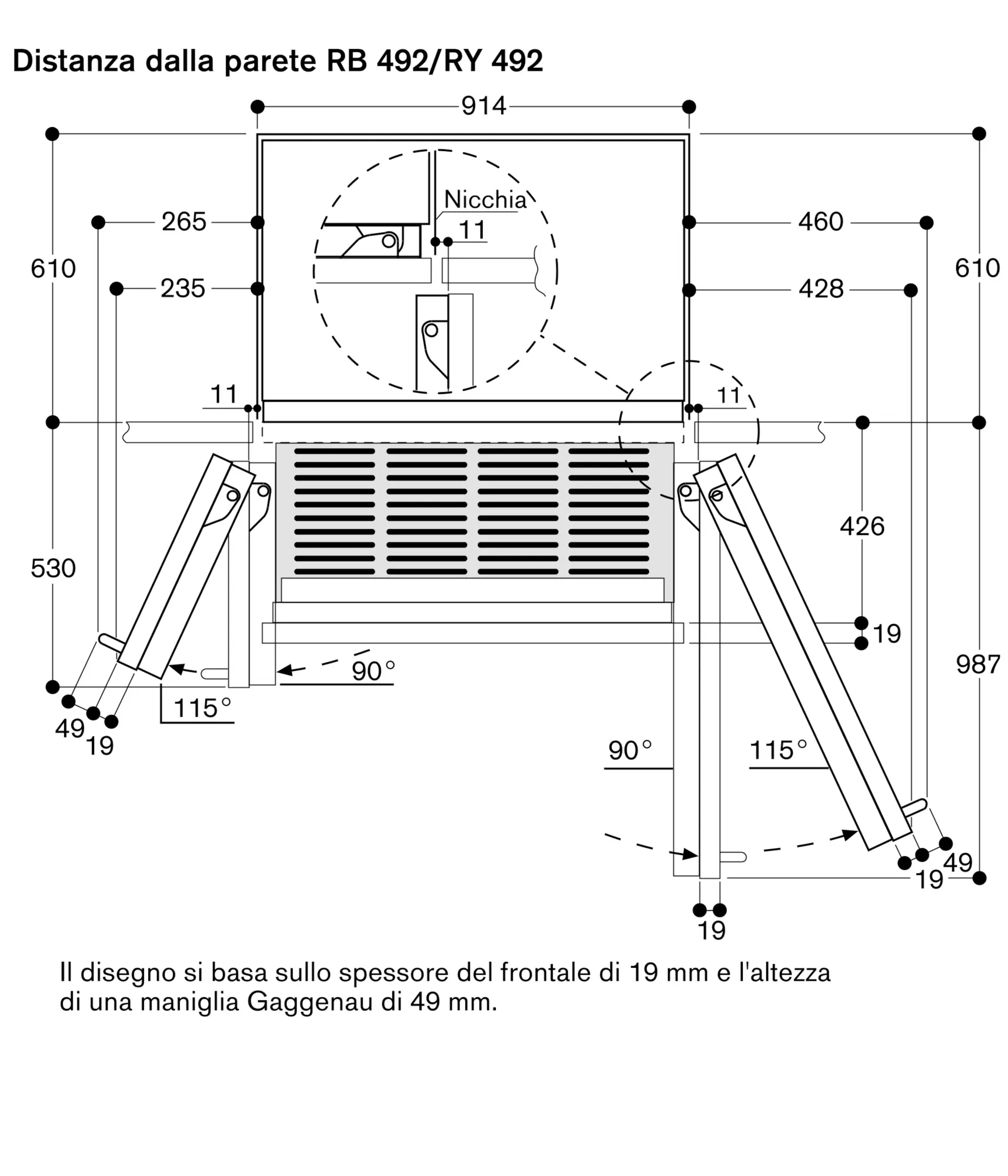 Angolo di apertura della porta di 115°, possibilità di bloccaggio a 90 °.