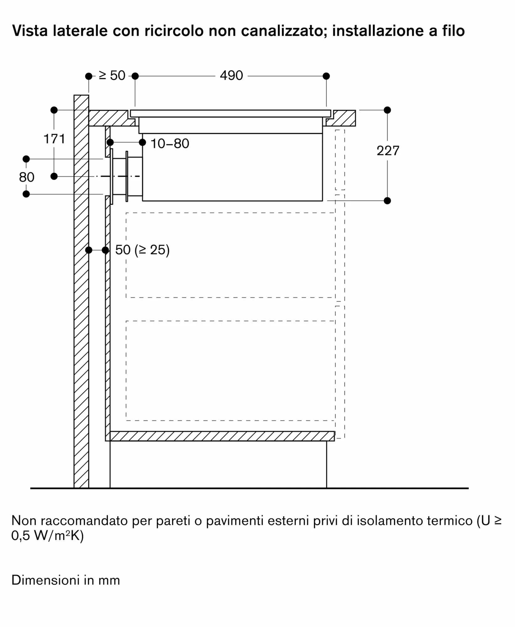 Per il set di circolazione dell'aria non guidata (CA 082 011), deve essere prevista un'apertura verticale di almeno 25 mm dietro la parete posteriore del mobile. 50 mm sono raccomandati per prestazioni ottimali.