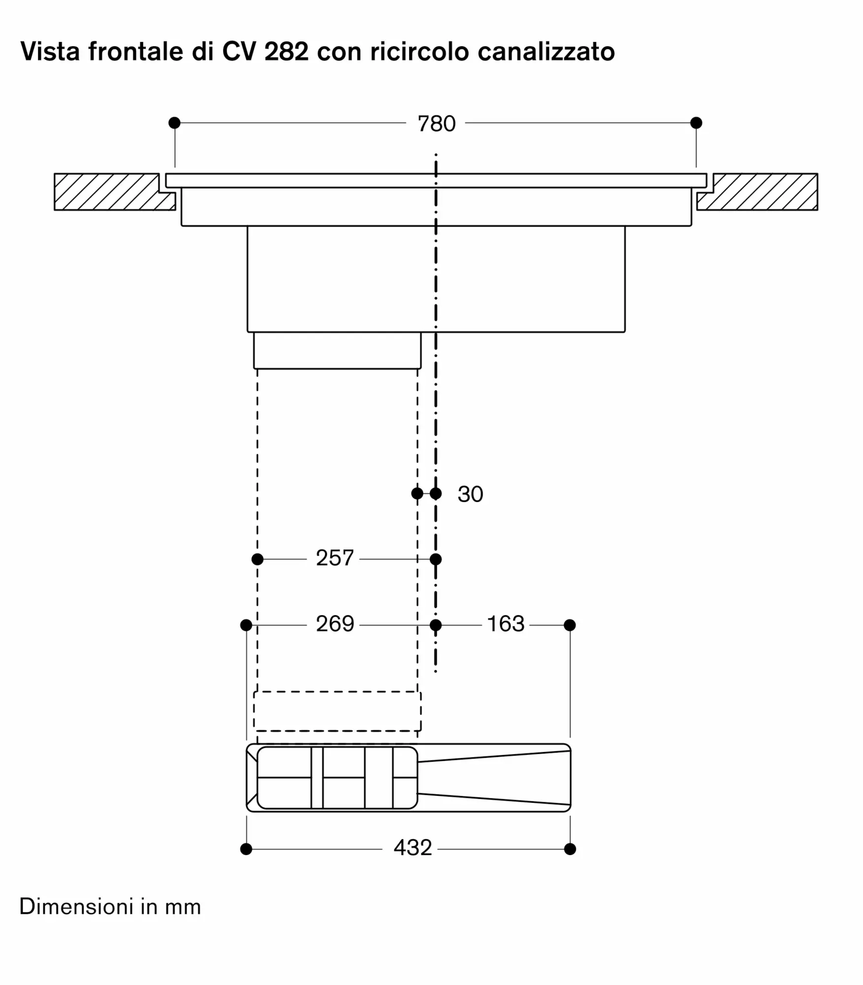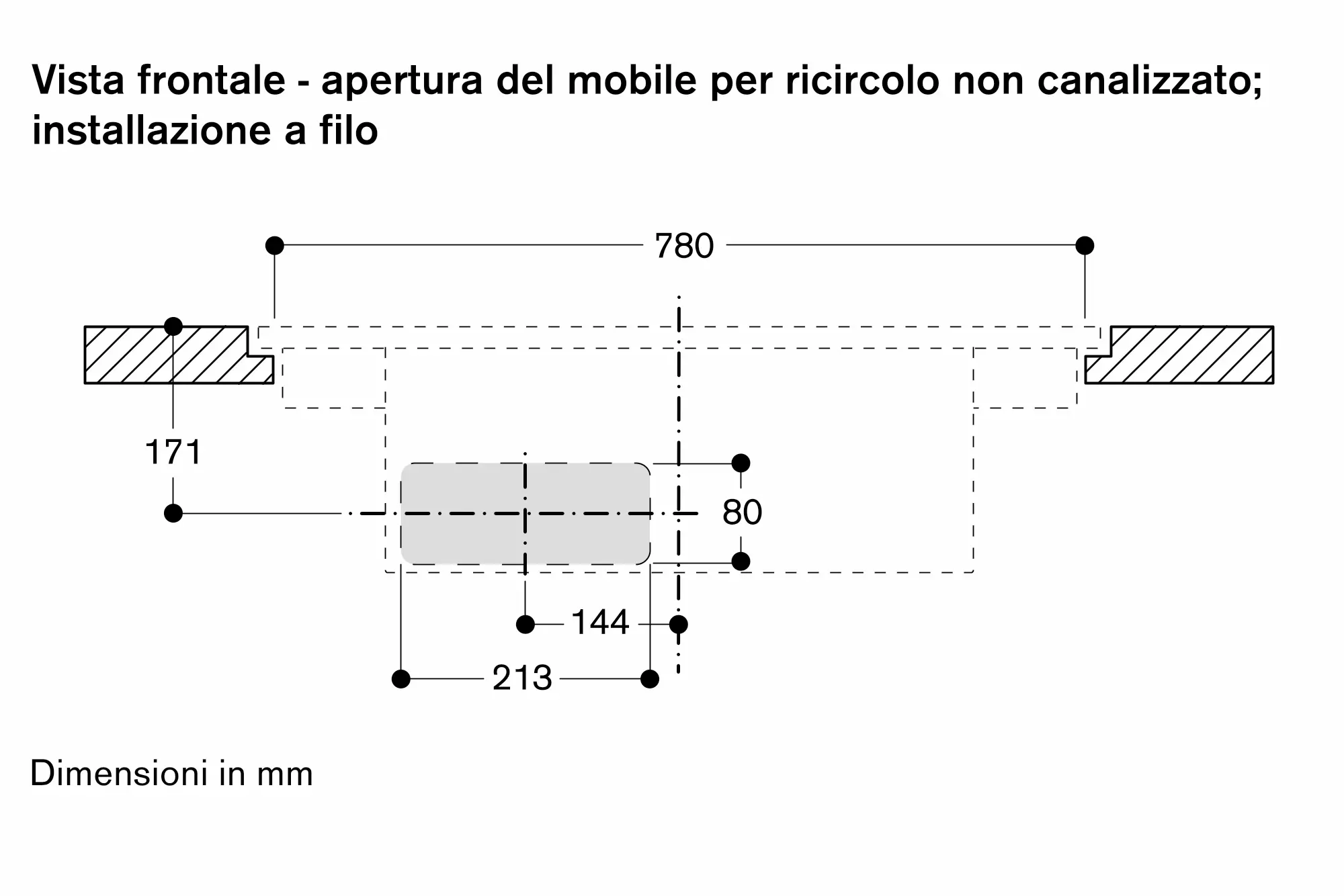 Profondità piano di lavoro: min. 60 cm per l'aria di ricircolo non guidata, min. 65 cm per l'aria di ricircolo/scarico guidata.