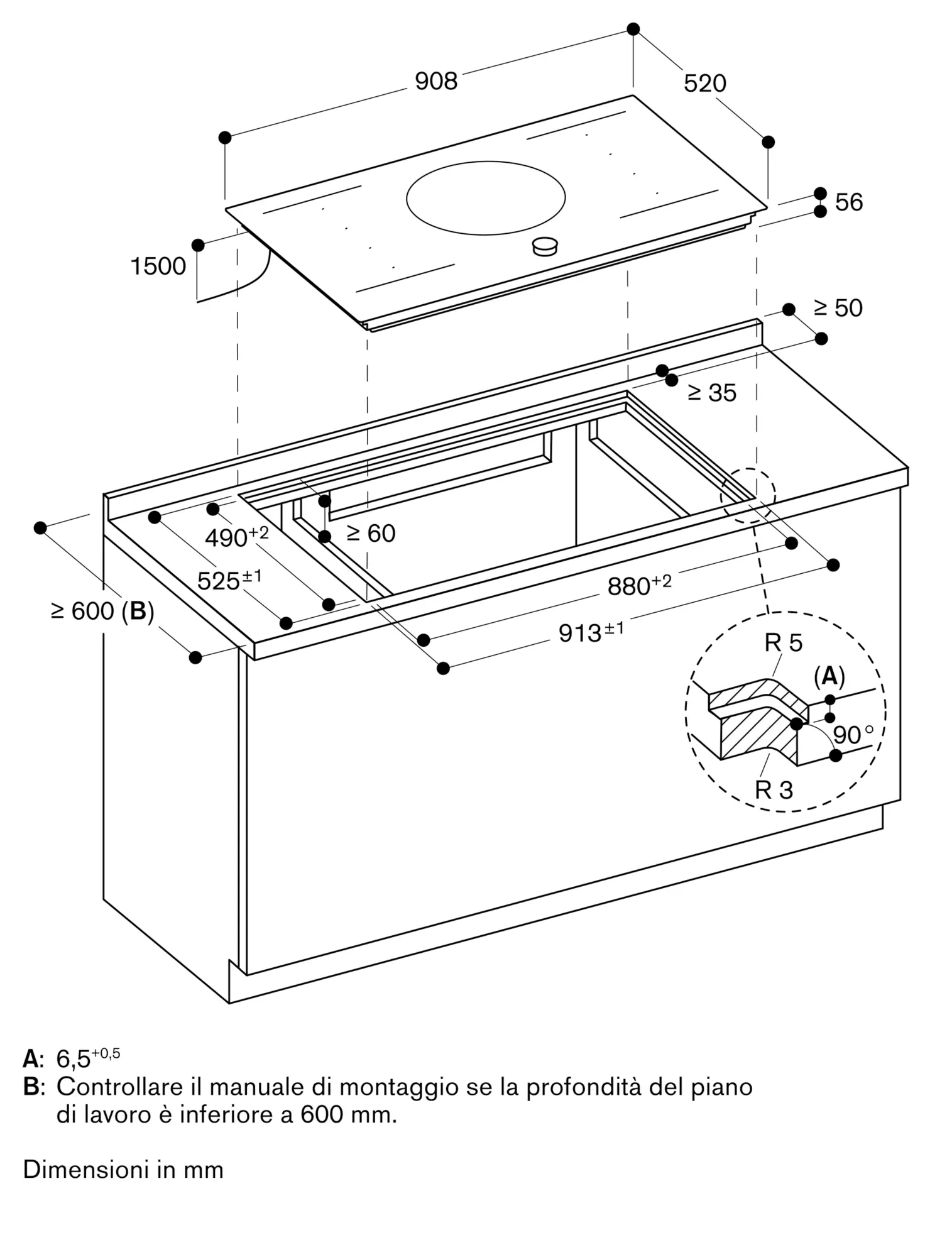 L'installazione è possibile in piani di pietra, sintetici o in legno massello. Devono essere rispettate la resistenza termica e la tenuta stagna dei bordi dell' intaglio. Per quanto riguarda gli altri materiali si prega di consultare il produttore del piano di lavoro.