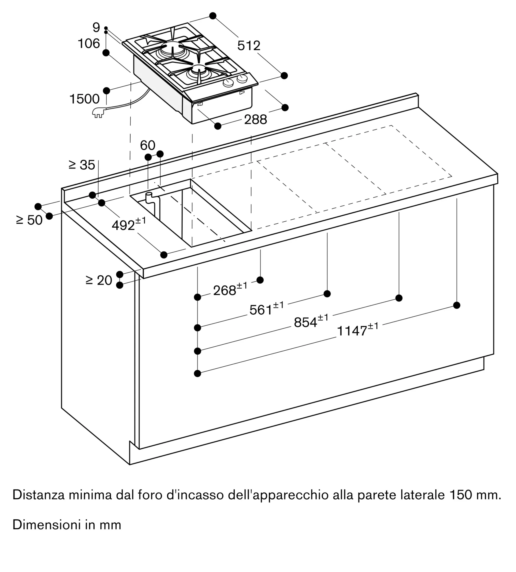 Lasciare una distanza min. 150 mm tra il piano e superfici sensibili al calore oppure applicare un' isolazione termica.