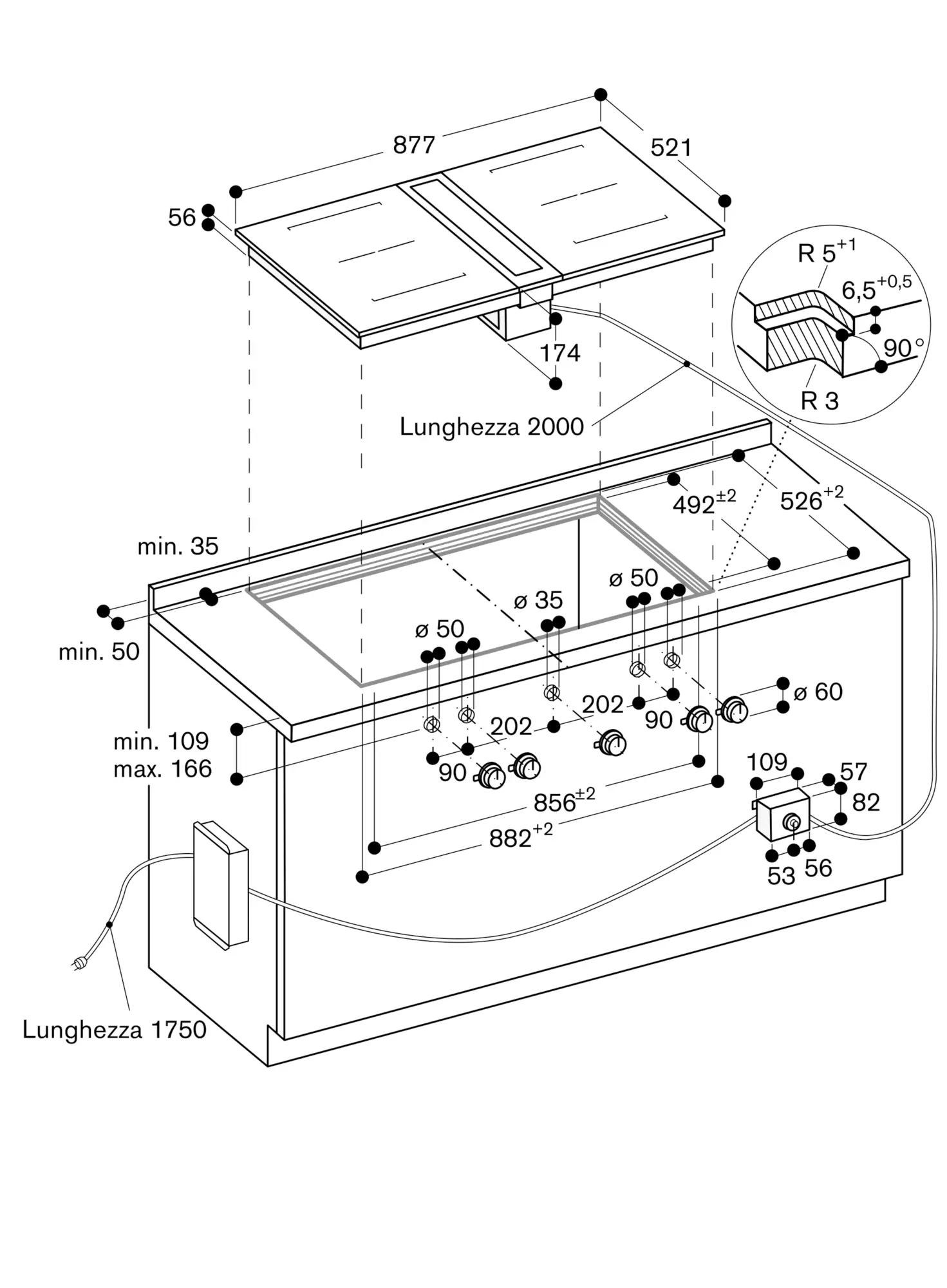 La misura della fuga tra il piano cottura e il top è variabile in base alla precisione dell'intaglio sul piano lavoro.