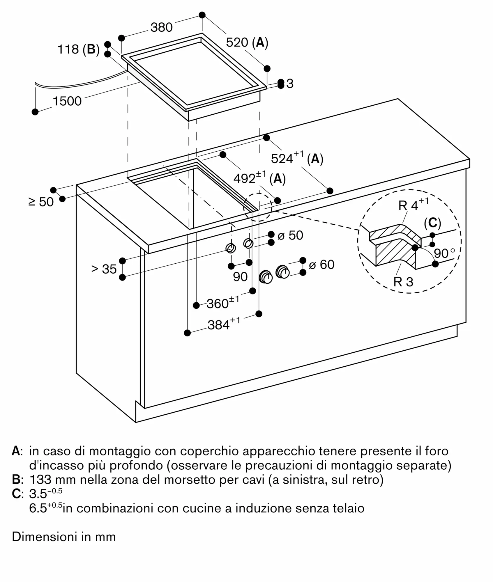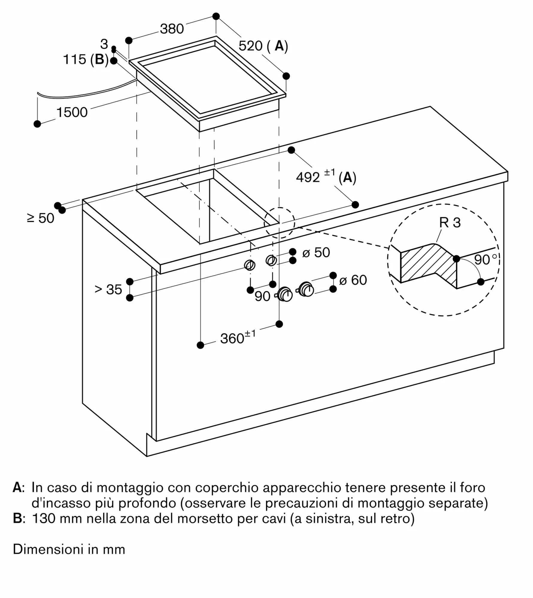 L'installazione è possibile in piani di pietra, sintetici o in legno massello. Devono essere rispettate la resistenza termica e la tenuta stagna dei bordi dell' intaglio. Per quanto riguarda gli altri materiali si prega di consultare il produttore del piano di lavoro.