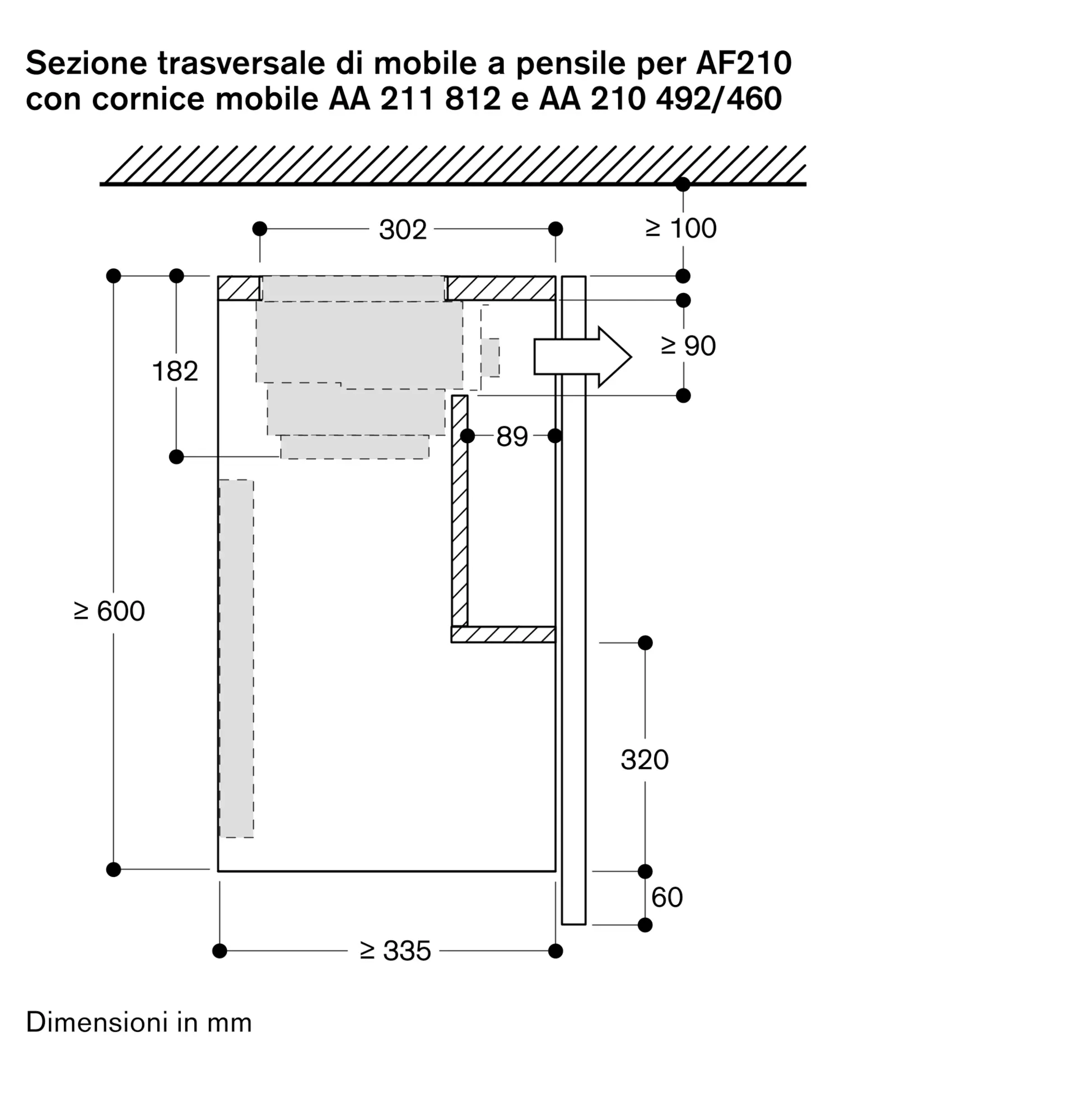 La profondità del cabinet superiore insieme nel kit di sospensione è di 335 mm.