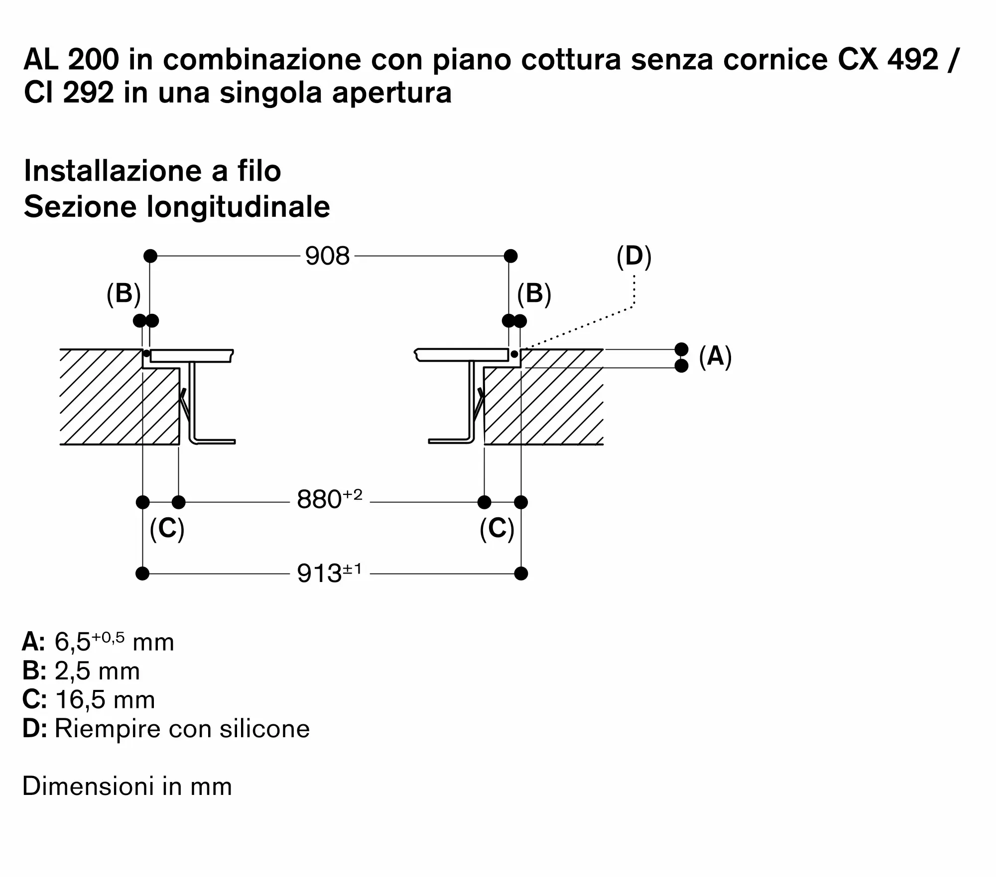 Compatibile con i piani cottura senza telaio serie 400 (CX 492) o 200 (CI 292), in un unico foro di lavoro. Per un montaggio a filo.
