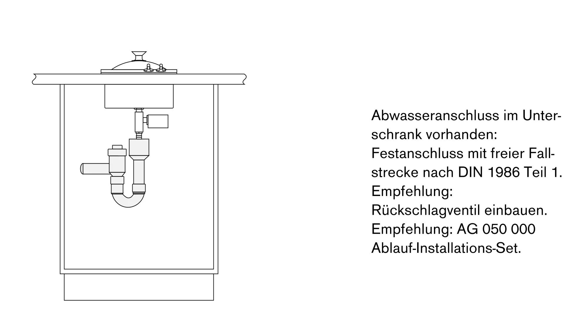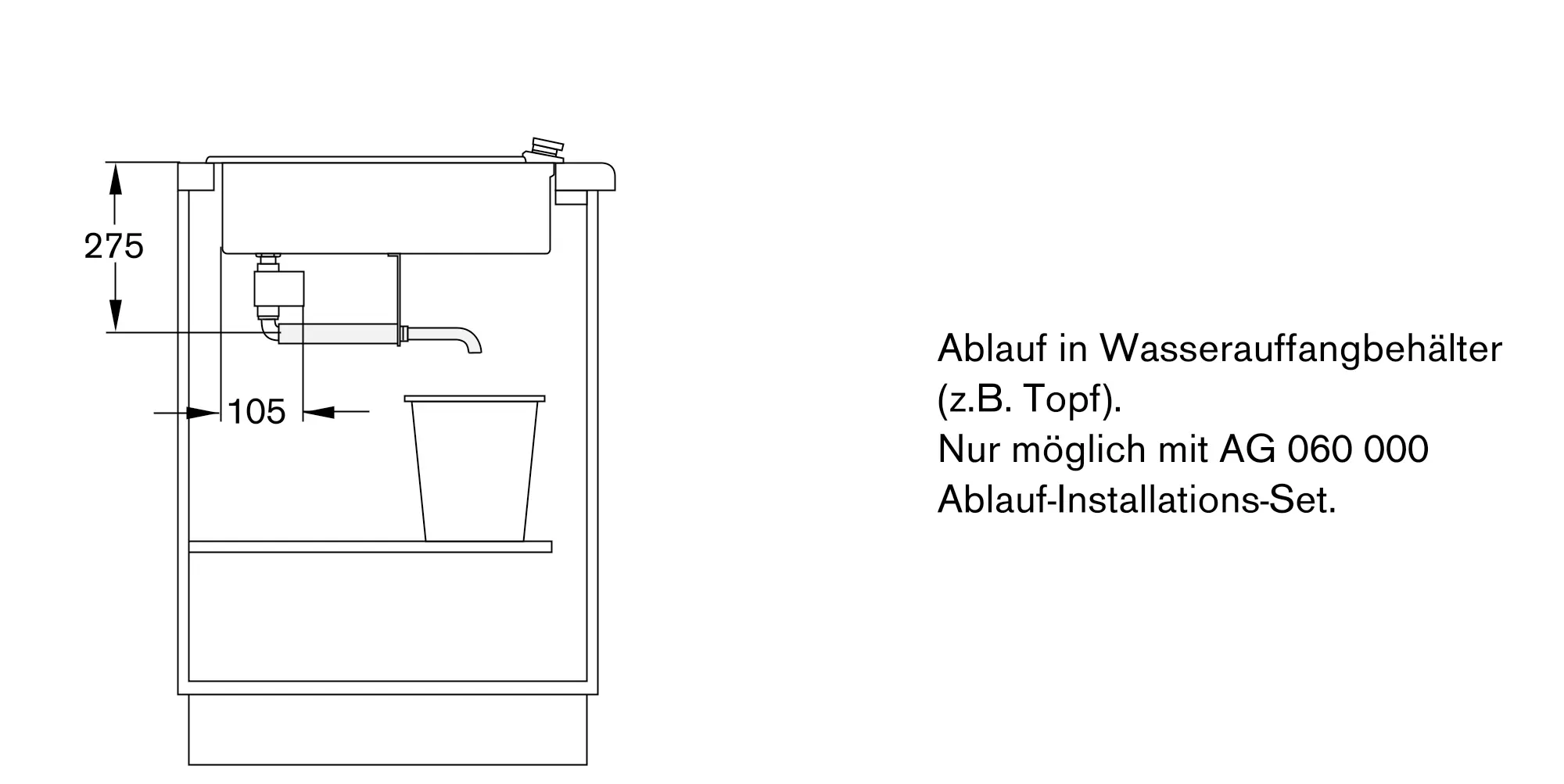 Gerät für Festanschluss an den Wasserablauf vorgesehen, jedoch auch ohne Festanschluss mit Sonderzubehör AG 060 montierbar.