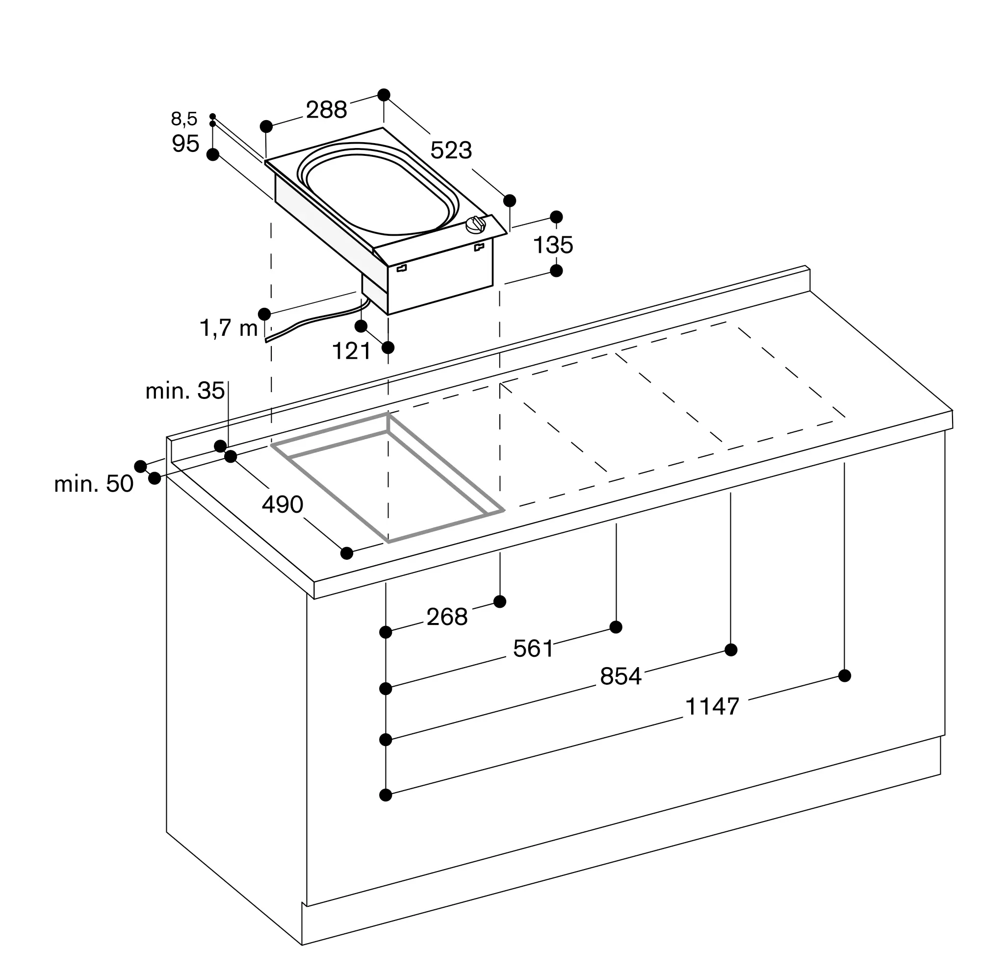 Der Abstand von der Oberkante der Arbeitsfläche zur Oberkante des Zwischenbodens muss mindestens 150 mm betragen.