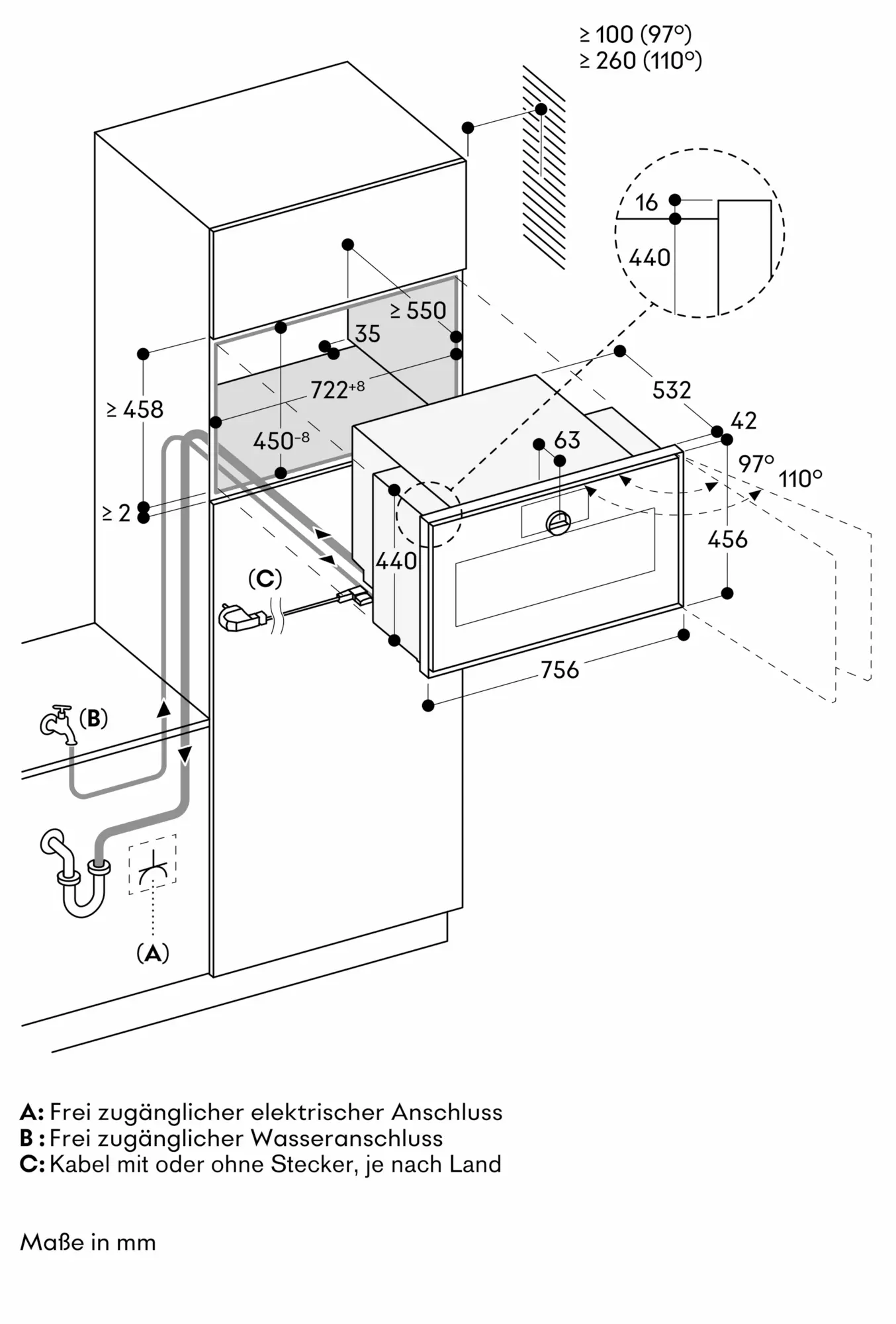 Anschlussdose muss zugänglich sein und außerhalb der Einbaunische vorgesehen werden.