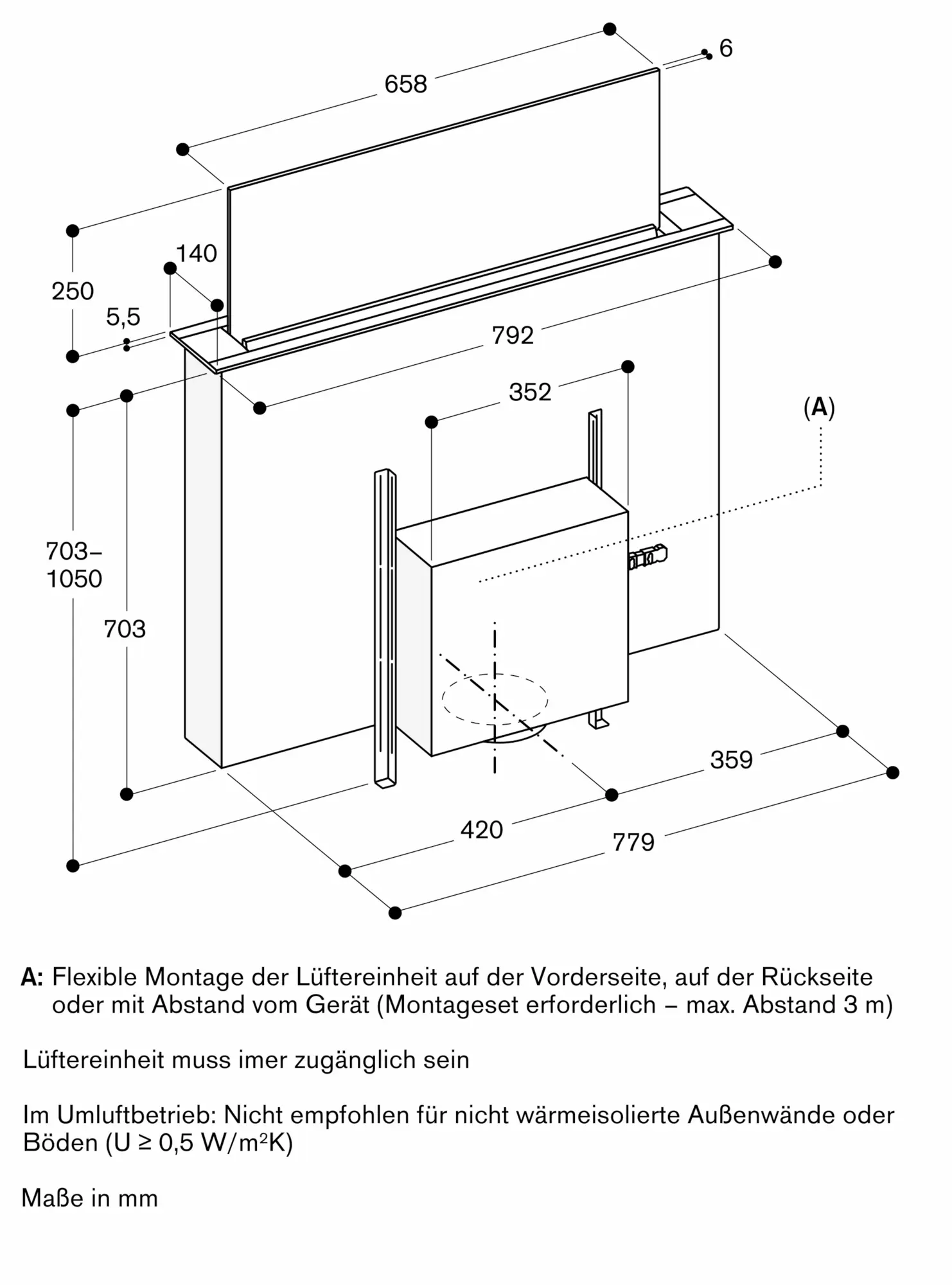Für eine optimale Performance im Umluftbetrieb wird eine Ausströmfläche von min. 400 cm² empfohlen.