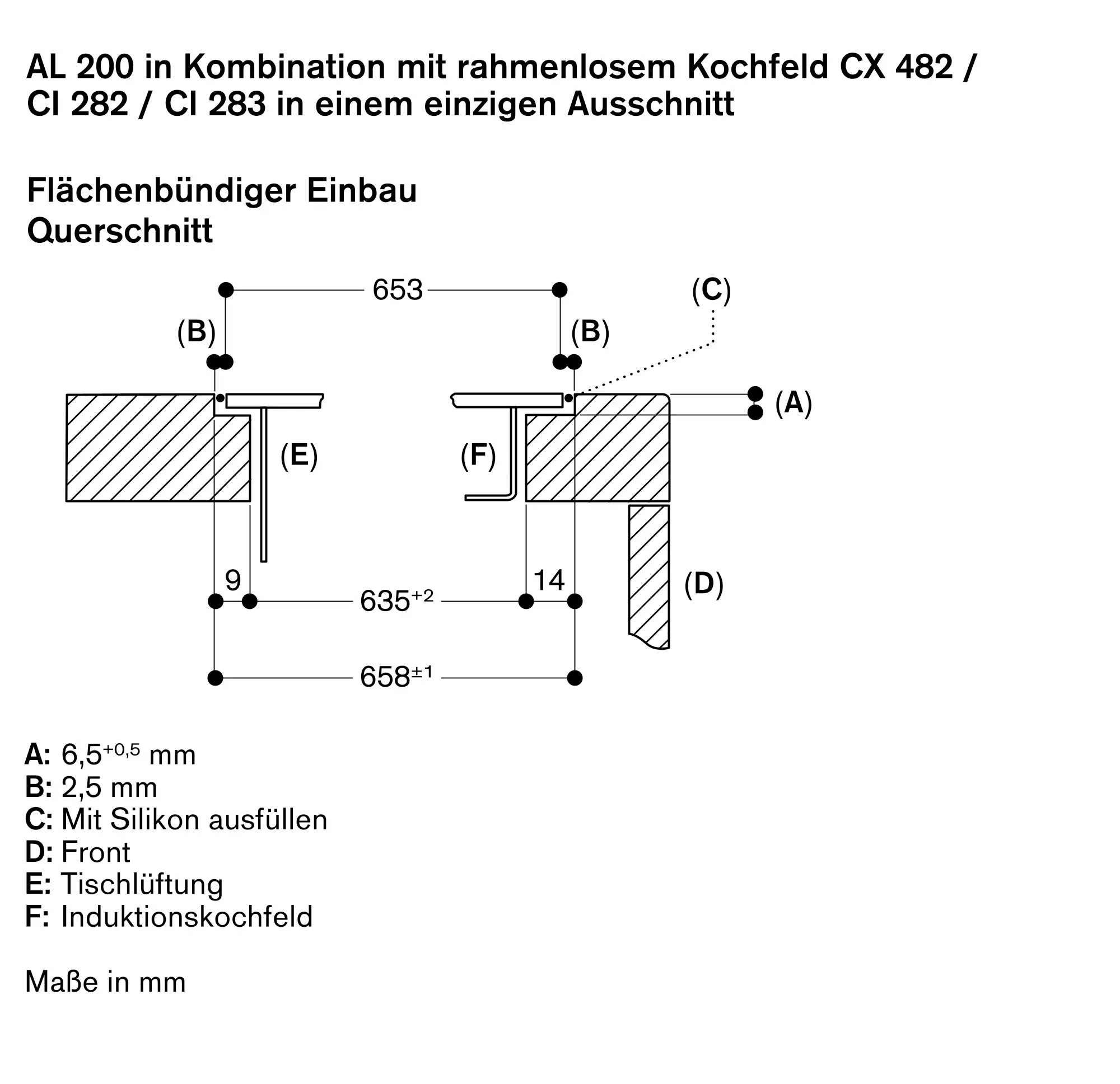 Kombinierbar mit Induktionskochfeldern der Serie 400 (CX 482 / VI 482) oder der Serie 200 (CI 282 / CI 283) in zwei separaten Arbeitsplattenausschnitten für aufgesetzten Einbau.