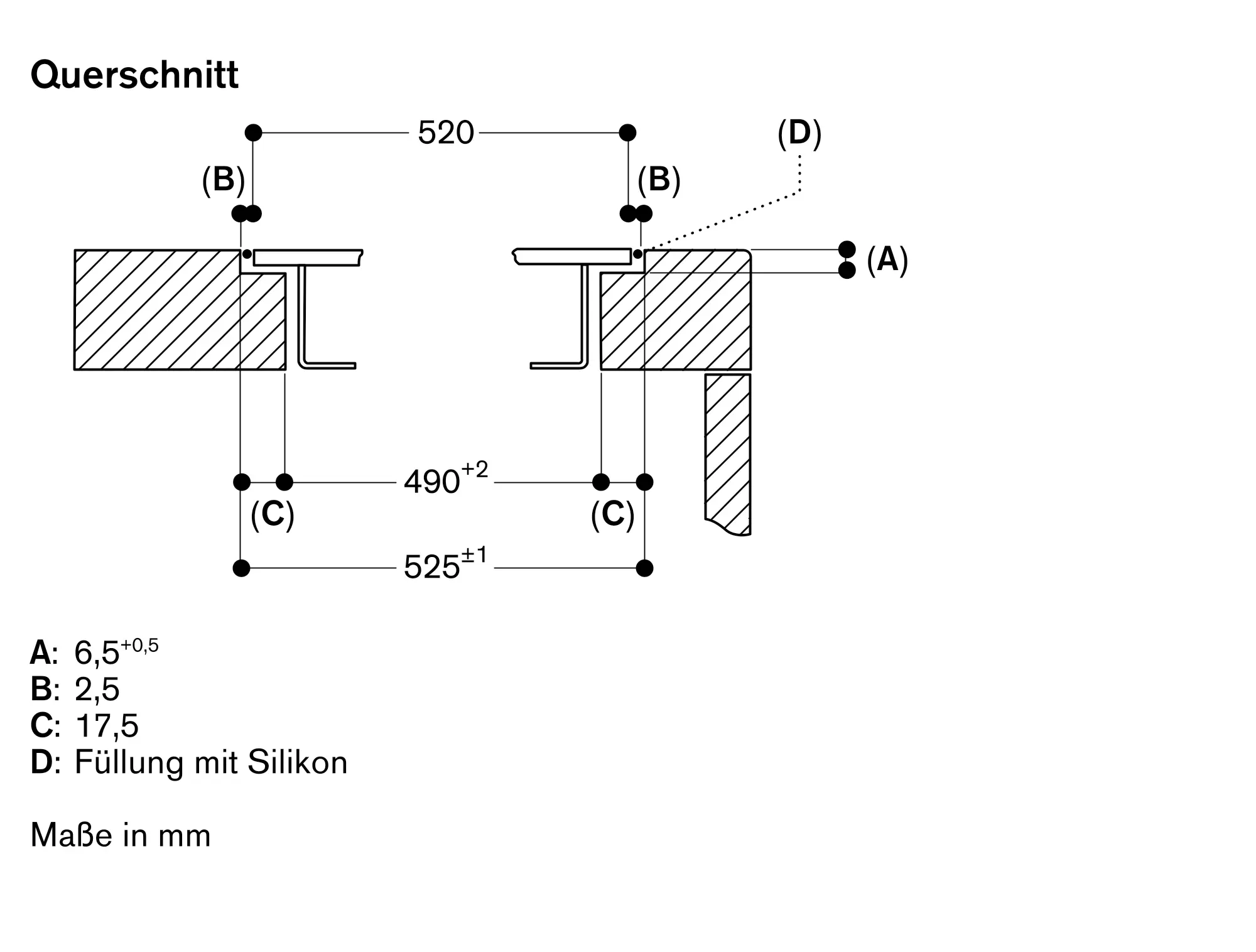 Durch Maßtoleranzen der Glaskeramikscheibe und des Arbeitsplattenausschnittes kann die Fugenbreite variieren.