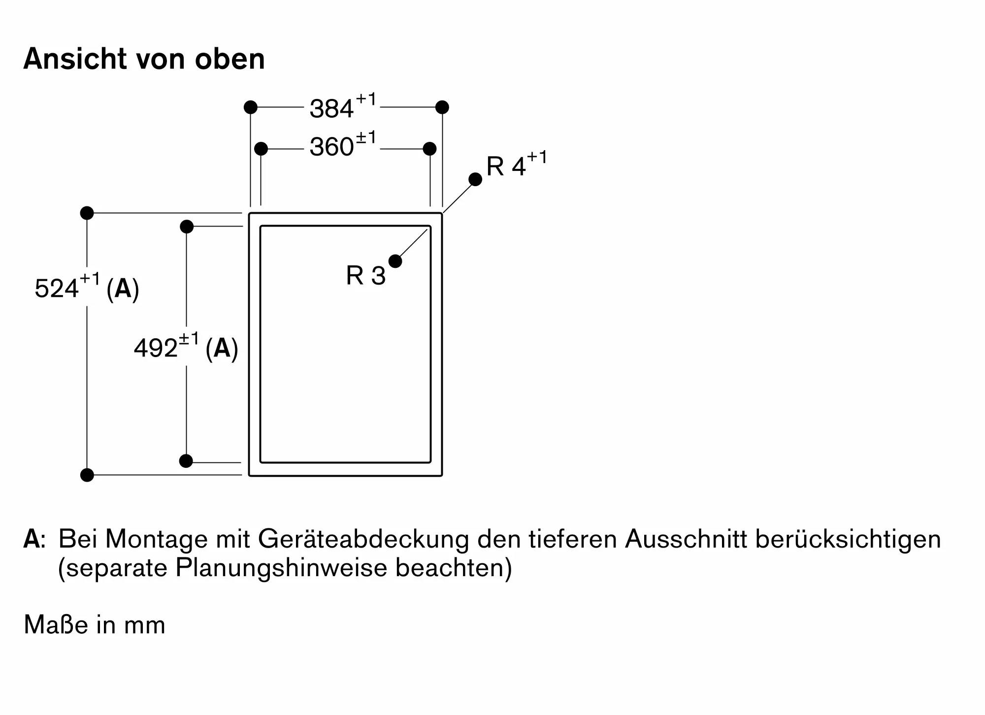 Der Mindestabstand zu einer übergebauten Abzugshaube ist bei den Planungshinweisen der individuellen Abzugshaube zu beachten.