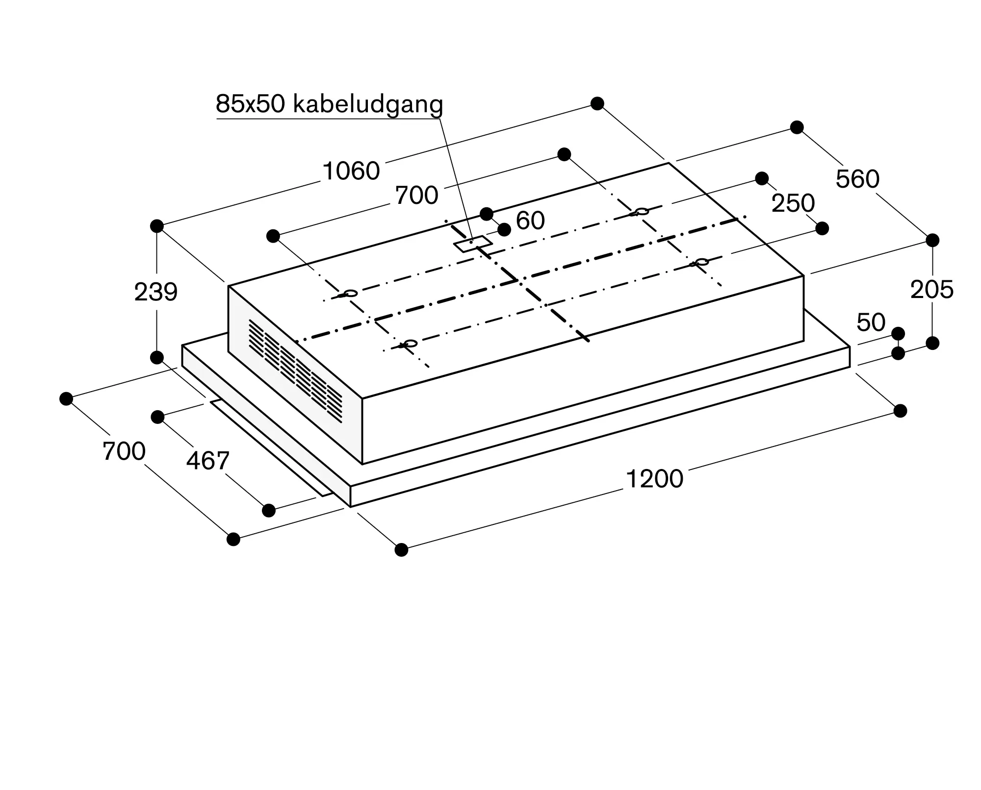 For at opfange mest muligt mados bør loftsemhætten mindst dække hele komfuret og bør placeres midt over det. Den kan ikke kombineres med VR, VP