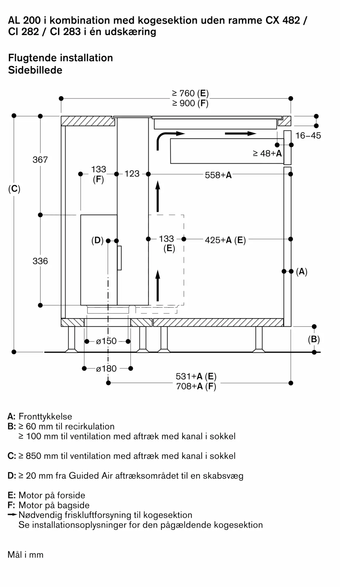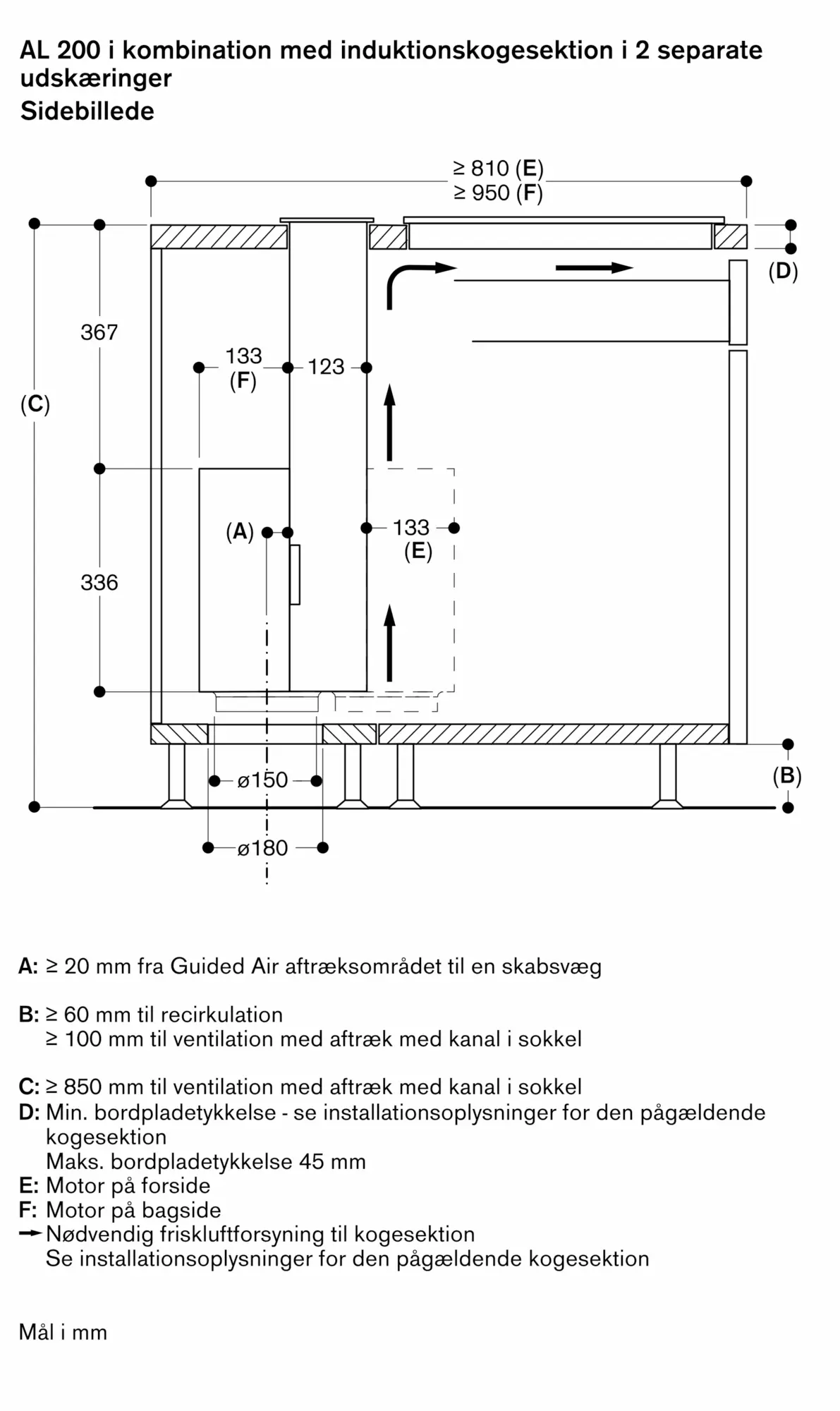 For at installere motorenheden på afstand skal der anvendes installationssæt AA 200 910 (med ekstra låg til at lukke luftudtræk). Maksimal afstand mellem bordventilation og motorenhed 3 m.