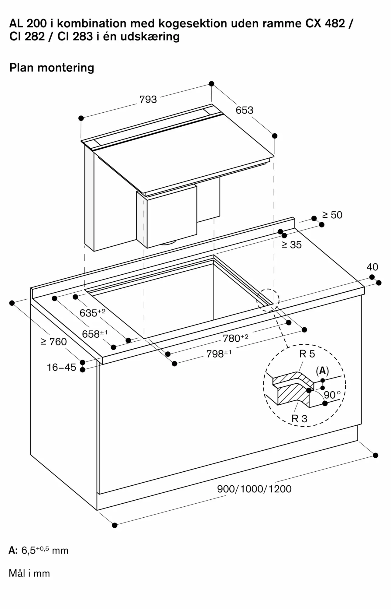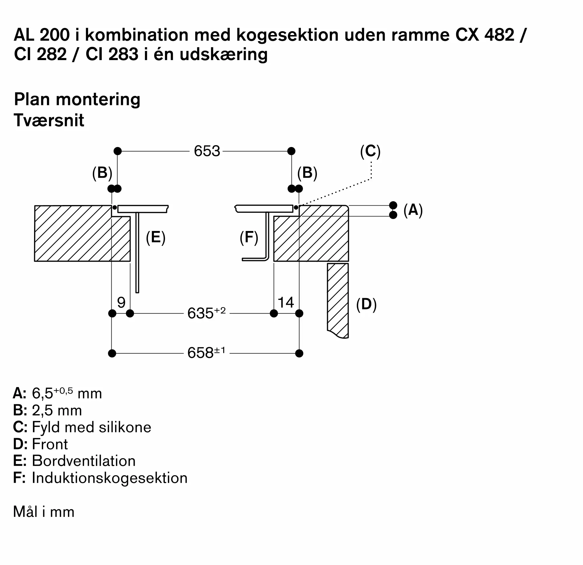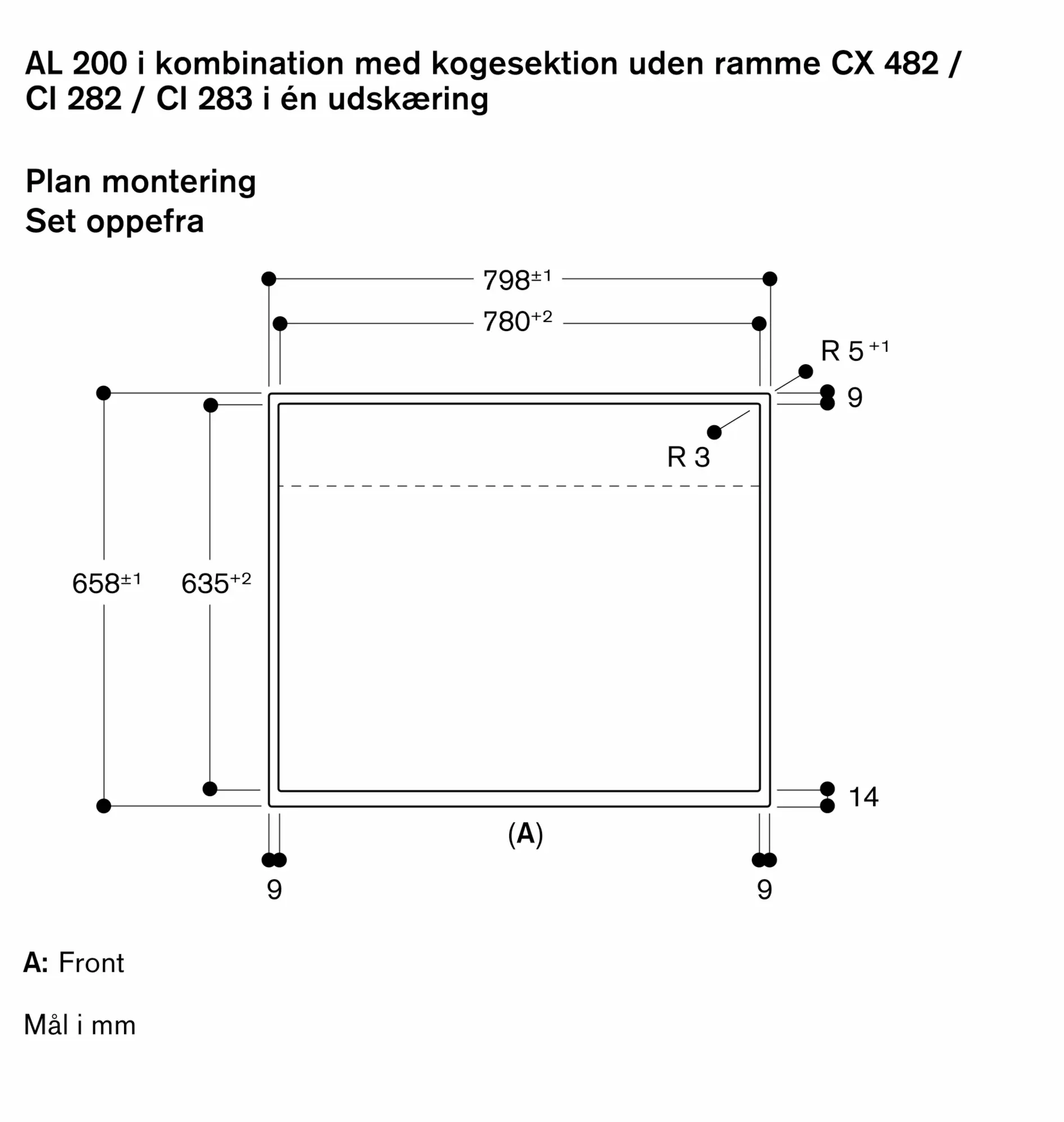 Passer til rammeløse kogetoppe i serie 400 (CX 482) eller serie 200 (CI 282 / CI 283) i en enkelt udskæring i bordpladen til plan montering.