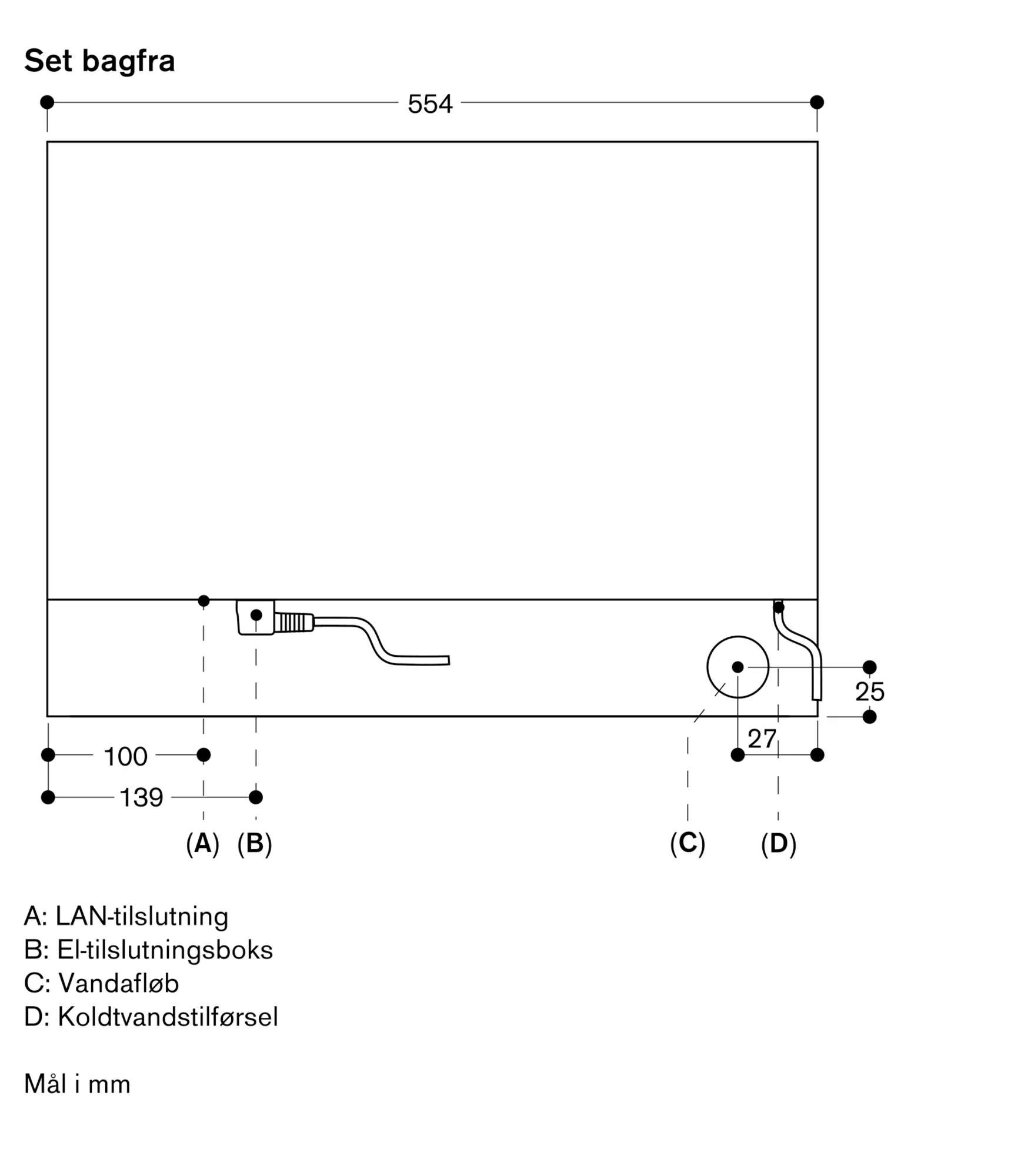 Vandtilslutningen for tilløbsslangen skal altid være tilgængelig, og må ikke befinde sig direkte under apparatet