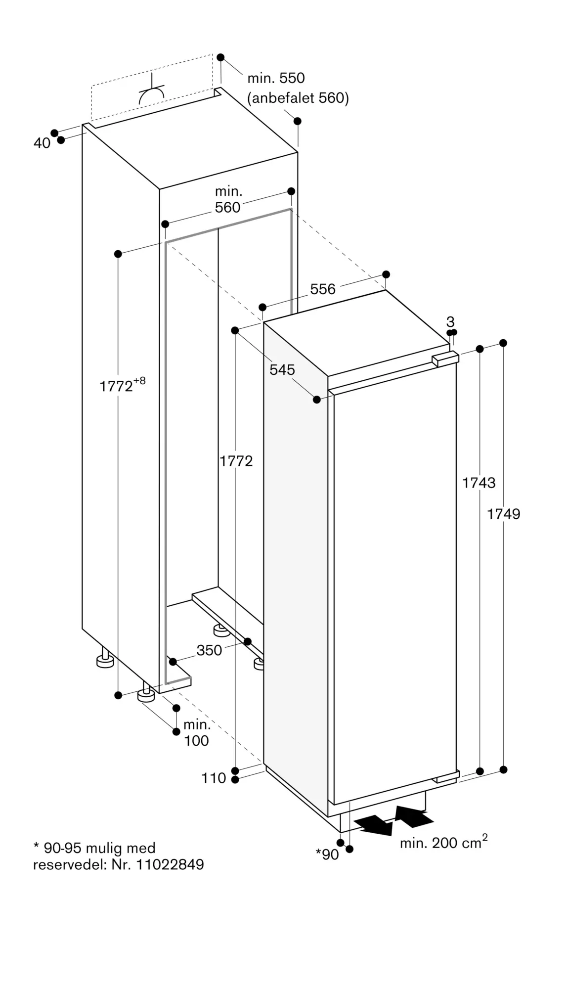 Sokkel på skab trukket tilbage 90 mm