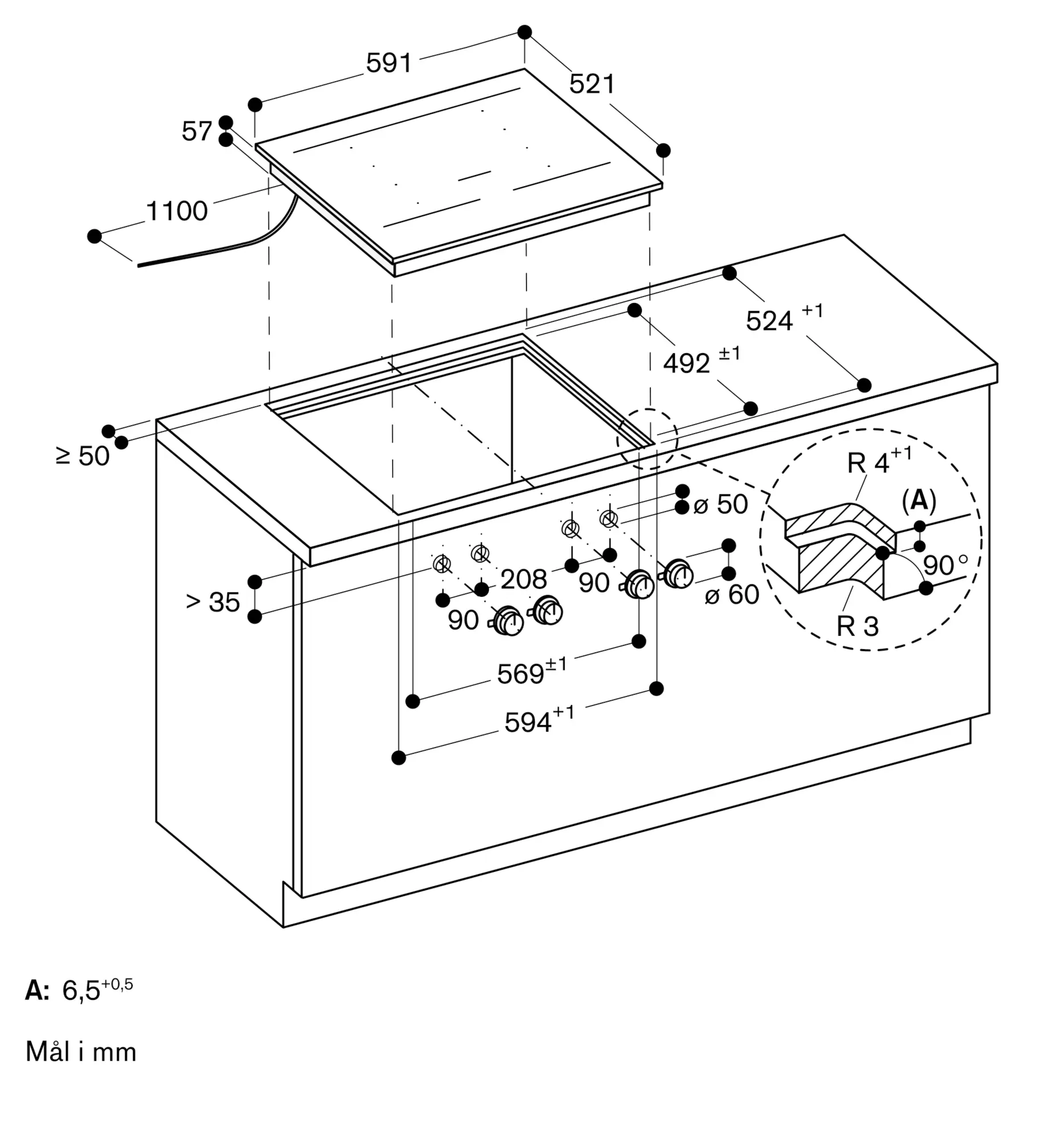 Den samlede bredde kan variere en smule på grund af størrelsestolerancer og udskæringen i bordpladen