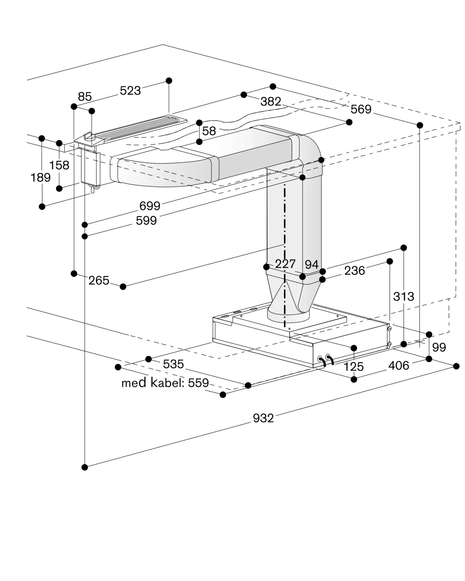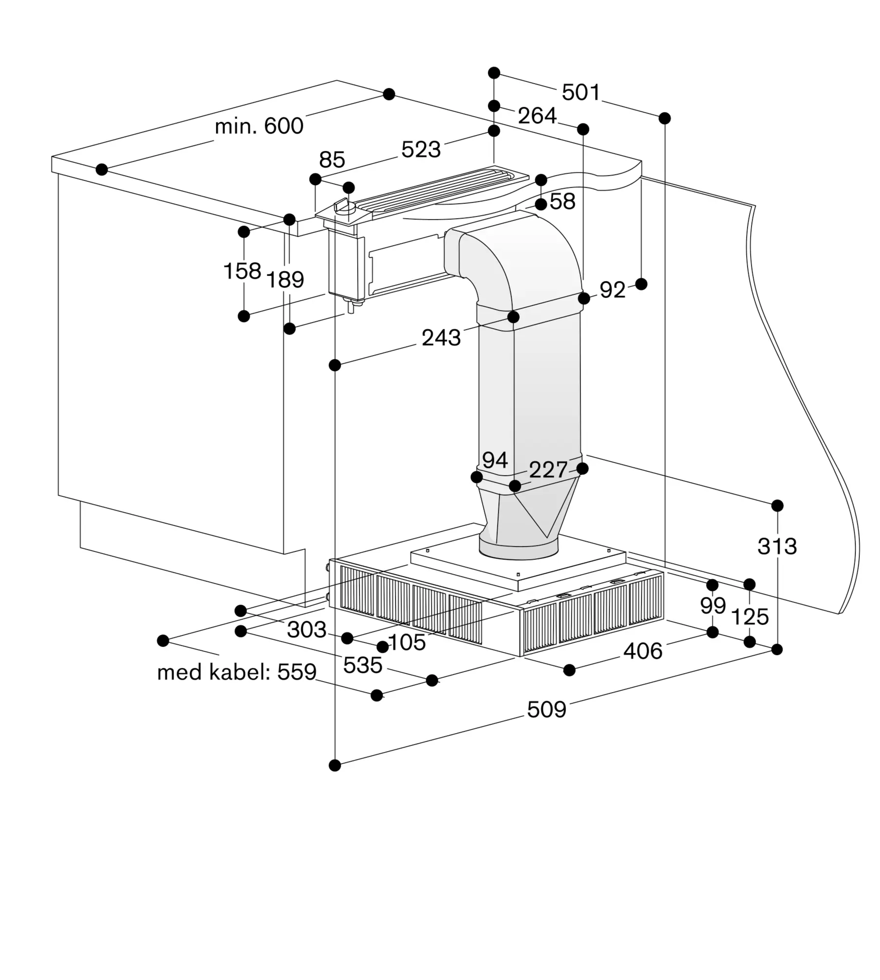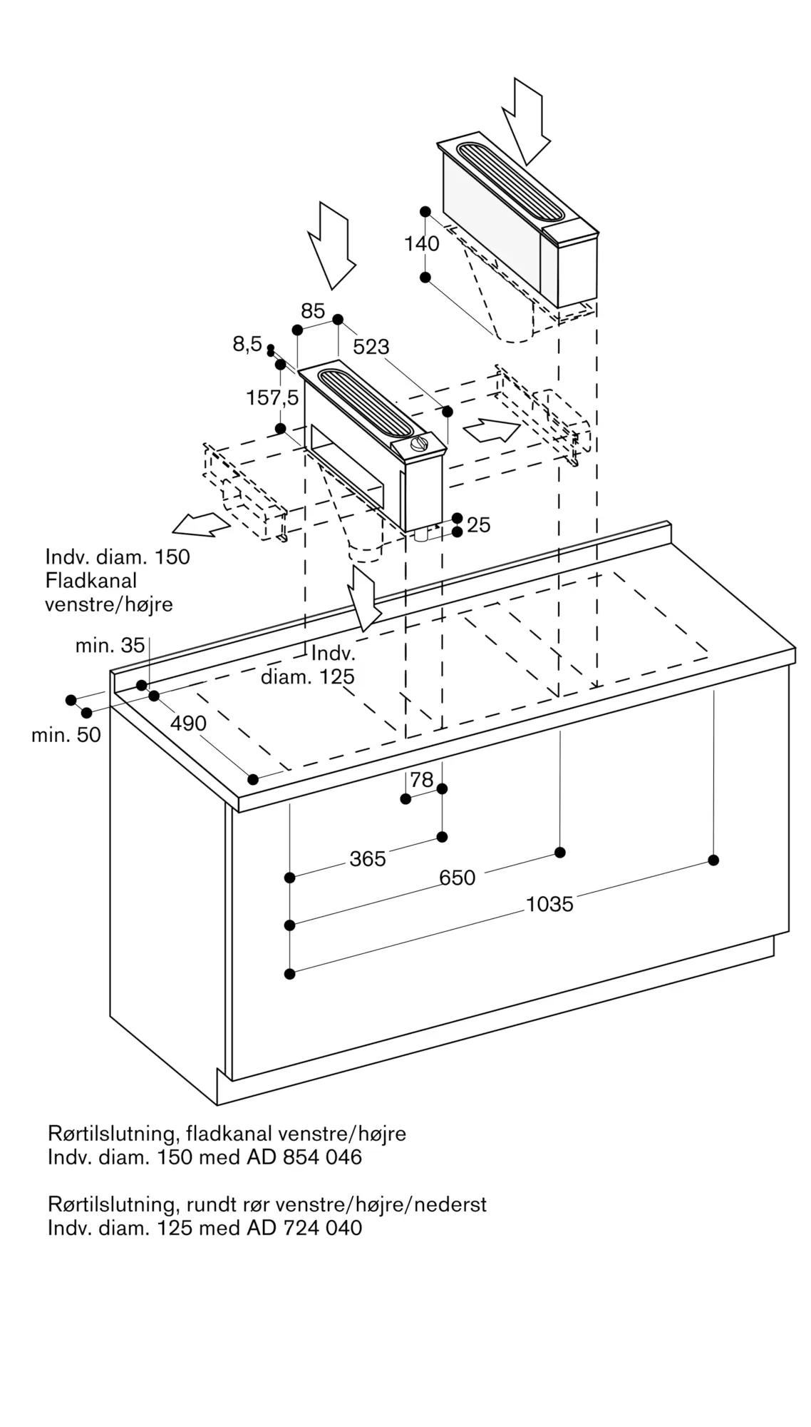 Ved installation ved siden af gaskogetop anbefales tilbehøret LS 041 001 for at sikre, at kogetoppen fungerer optimalt. Ved installation ved siden af gaskogetop må der ikke bruges flade kanaler ved rørføringen til motorenheden