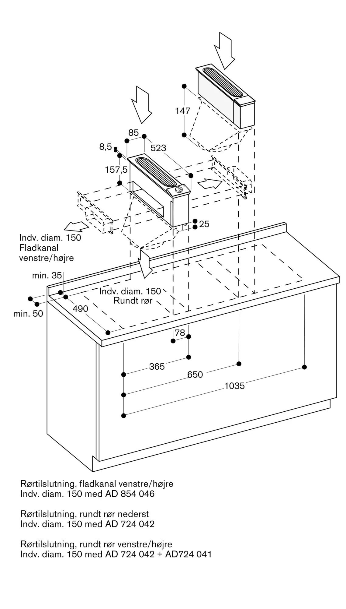 Luftudsugning i kombination med separat ventilatorenhed AR 403 121 eller recirkulation med AR 413 121
