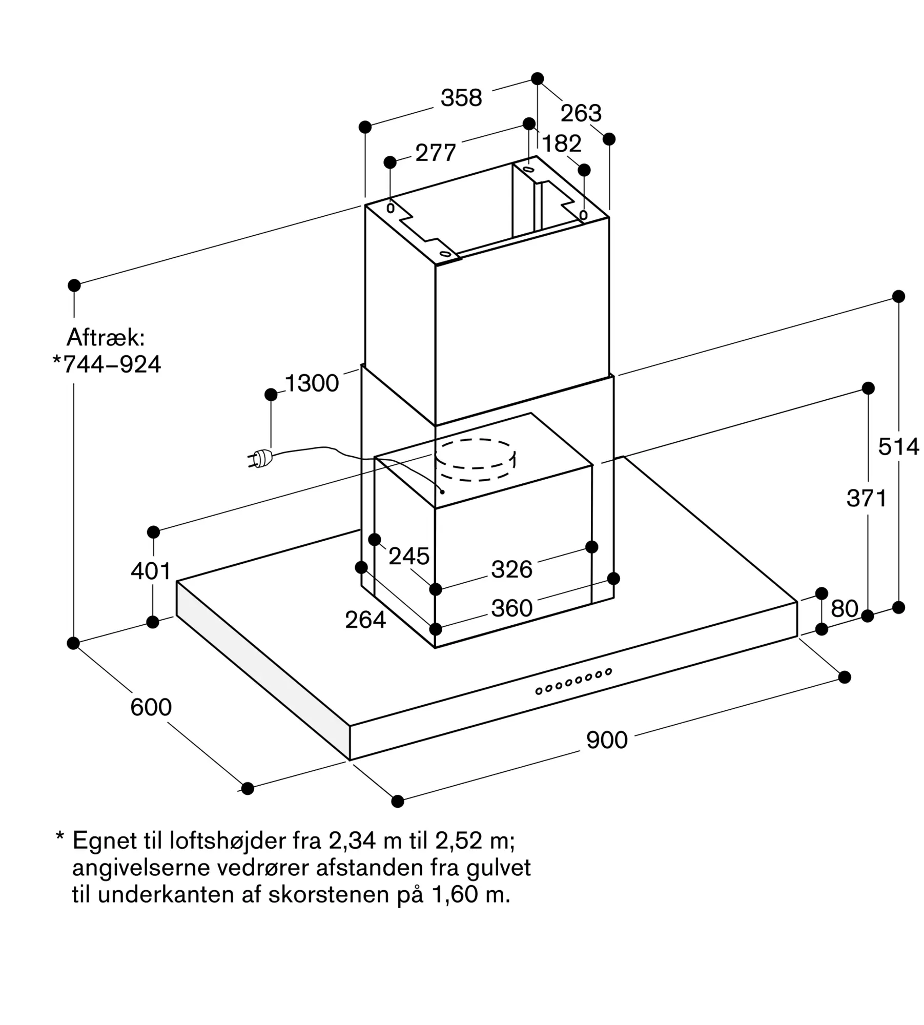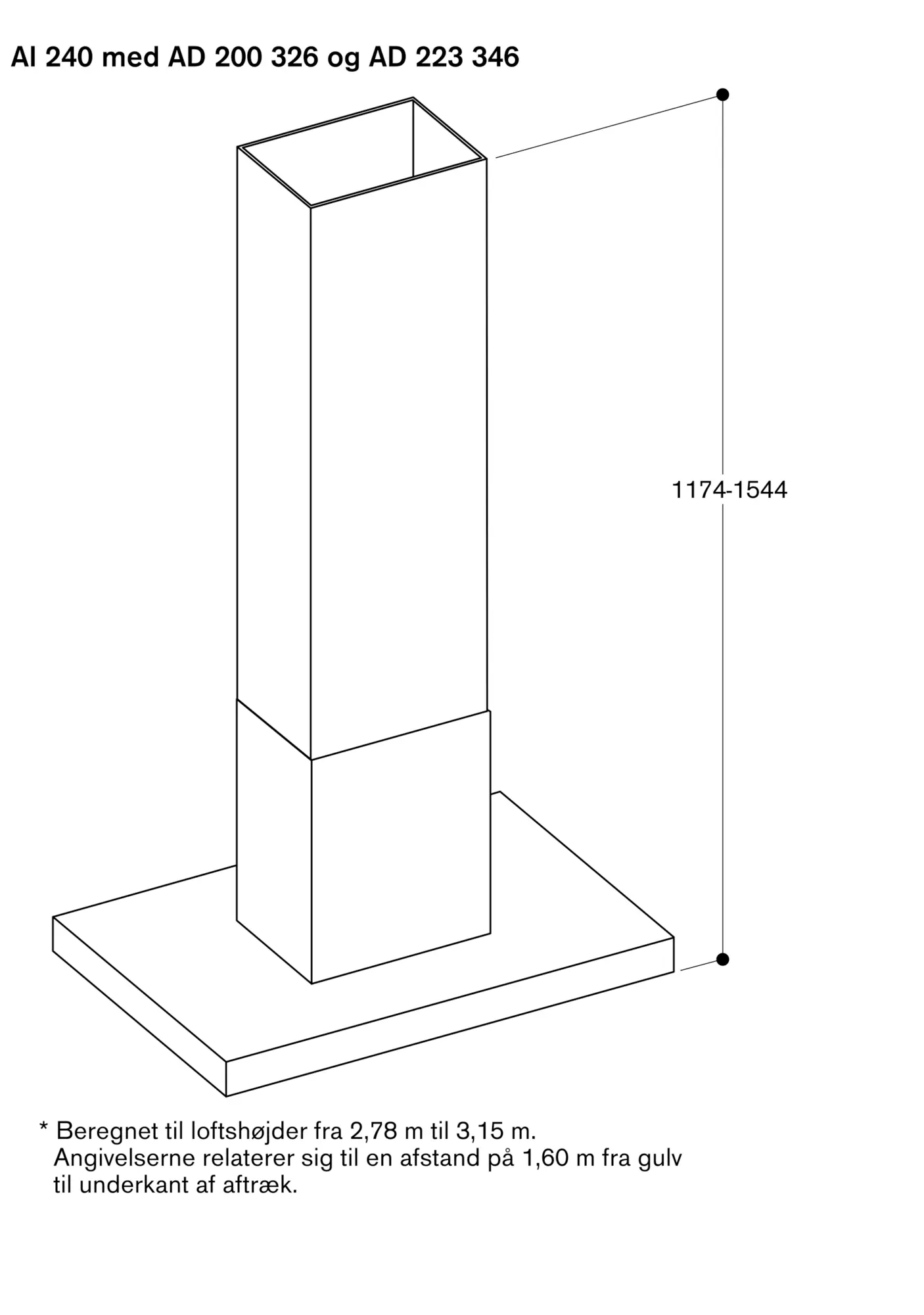 Pakken inkluderer monteringsbeslag og den todelte aftrækskanal med dimensioner fra 664 mm til 844 mm. Kanalen kan tilpasses til den enkelte indretning ved hjælp af den særlige luftkanalforlænger AD 200 326 i kombination med monteringsforlængelsen AD 223 364. Særlige kanaler fås på anmodning