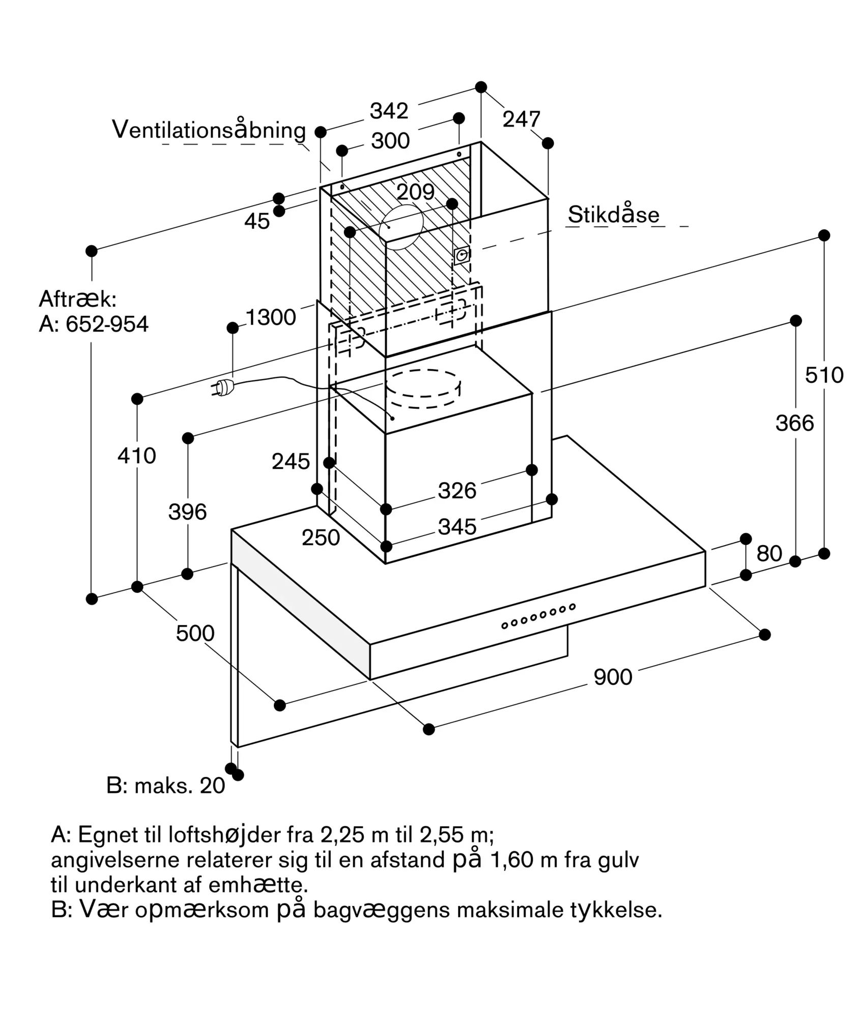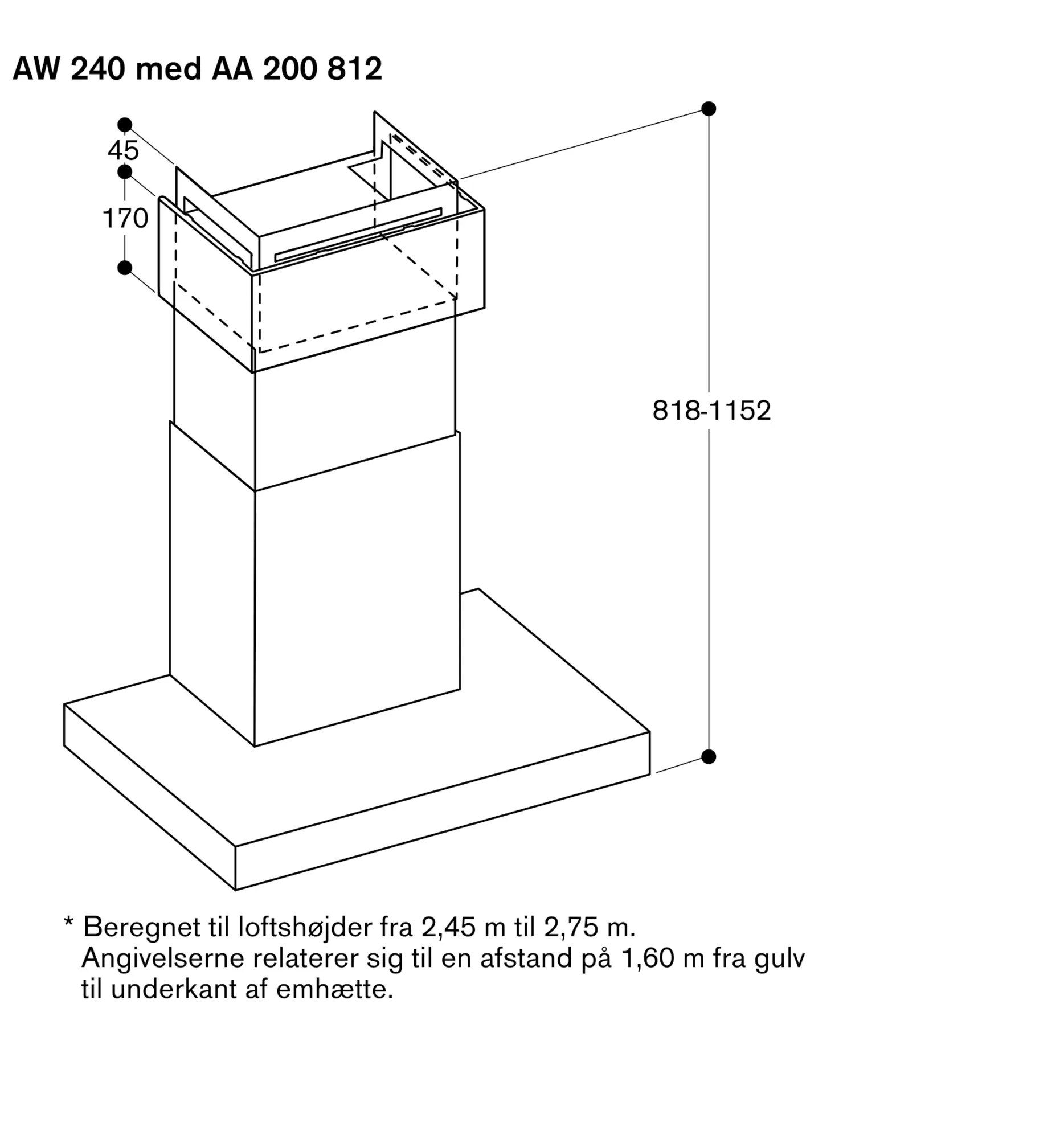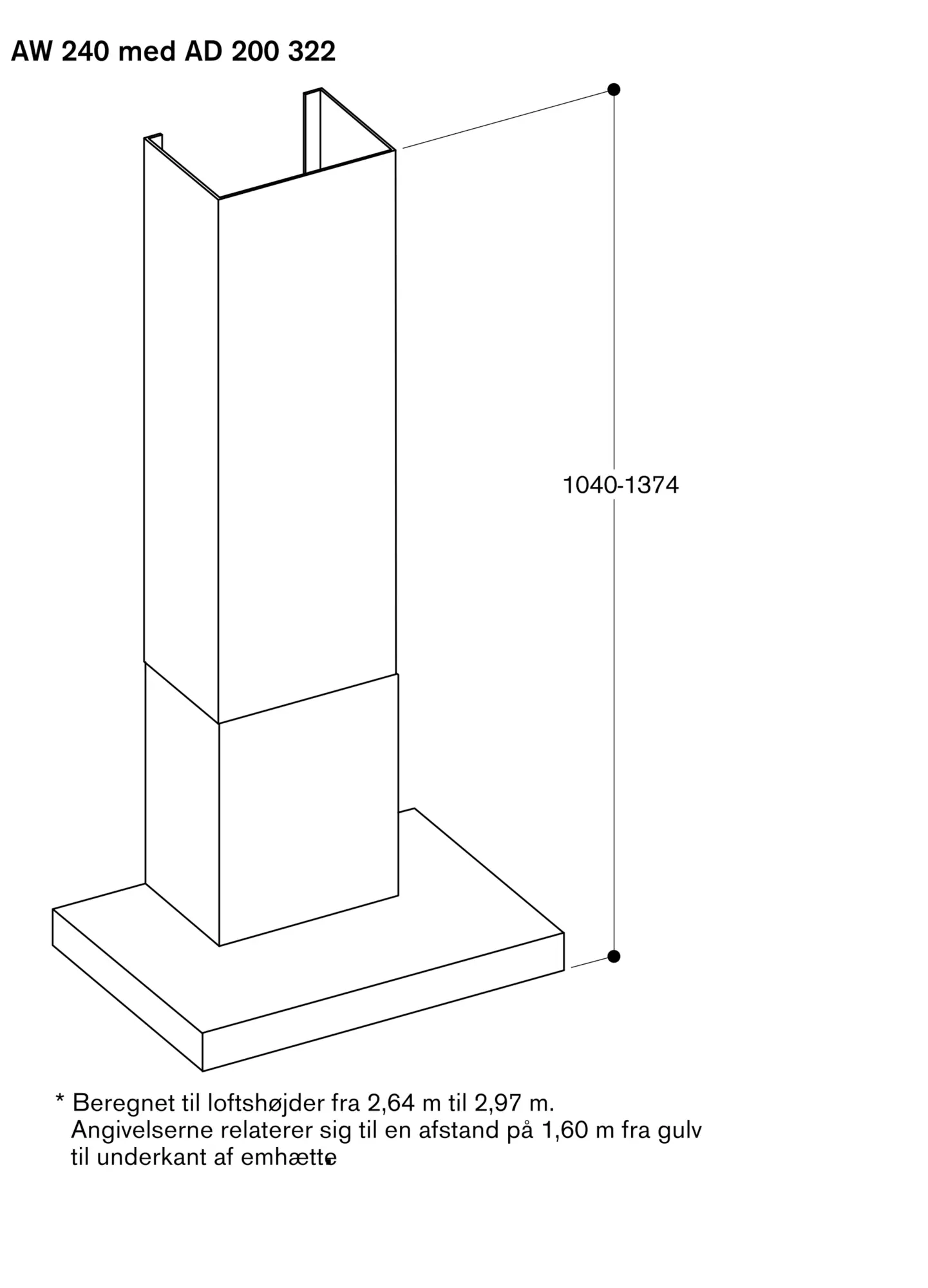 Pakken inkluderer den todelte aftrækskanal med dimensioner fra 572 mm til 874 mm. Kanalen kan tilpasses til den enkelte indretning ved hjælp af den særlige luftkanalforlænger AD 200 322 eller ved at afkorte den nederste del af teleskopkanalen. Særlige kanaler fås på anmodning