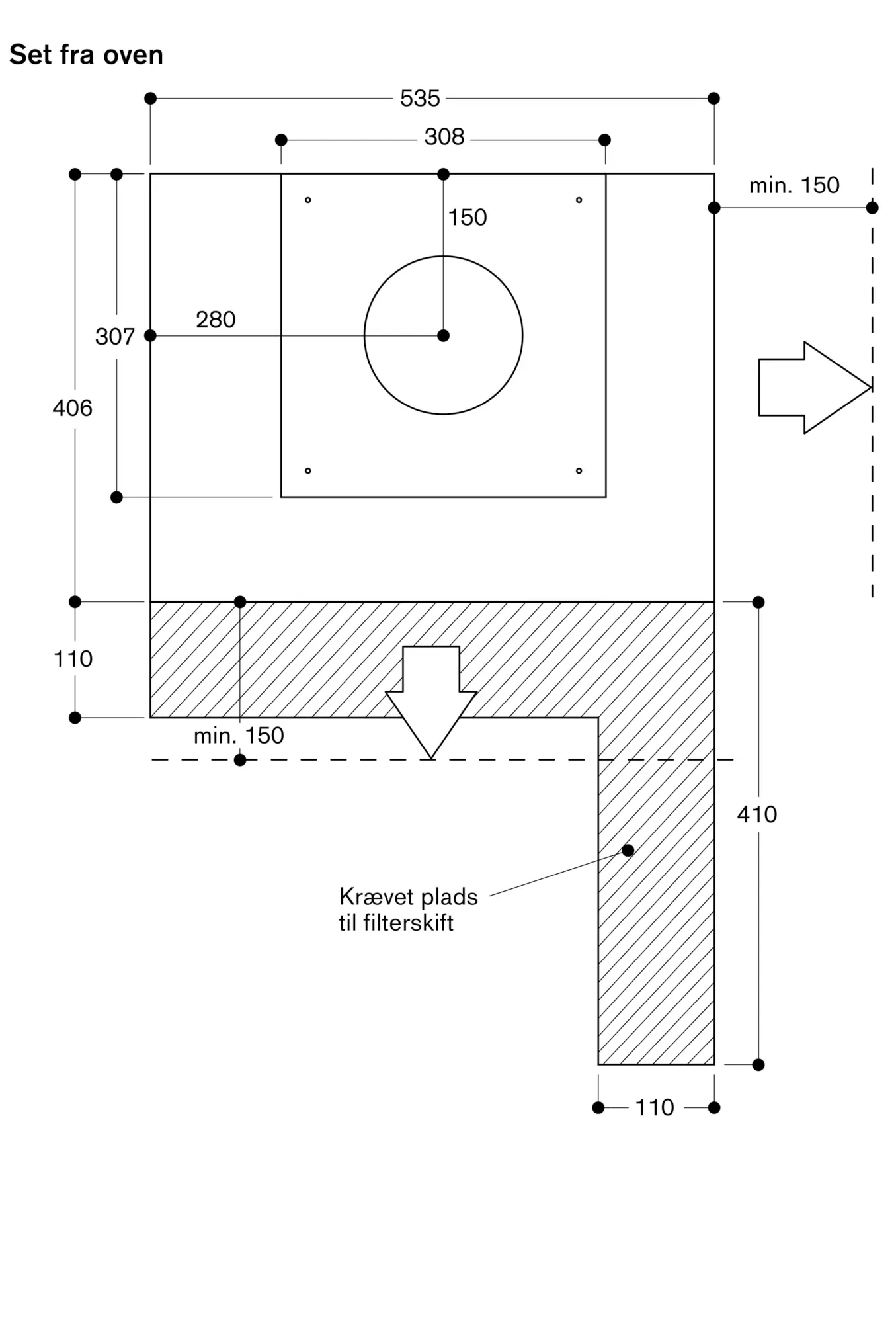 Filterudskiftningsinterval: 1-1,5 år, alt efter hvor meget mad, der laves. Det skal være muligt at fjerne soklen for at kunne skifte filter. Anbefalet afstand fra filteråbning til skabsvæg, medmindre der findes en ventilationsrist direkte i fronten: 15 cm