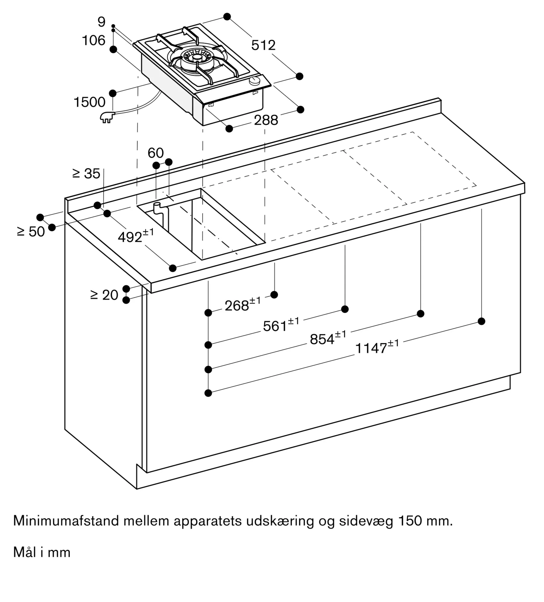 Der skal være mindst 150 mm til varmefølsomme møbeldele eller afsætningsplads. Alternativt kan varmeisolering anvendes