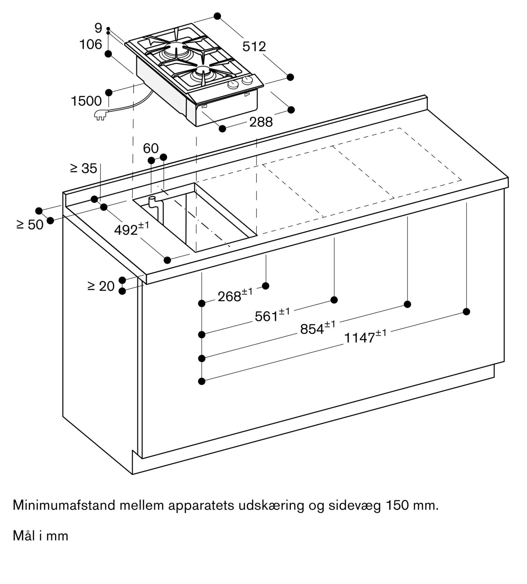 Der skal være mindst 150 mm til varmefølsomme møbeldele eller afsætningsplads. Alternativt kan varmeisolering anvendes