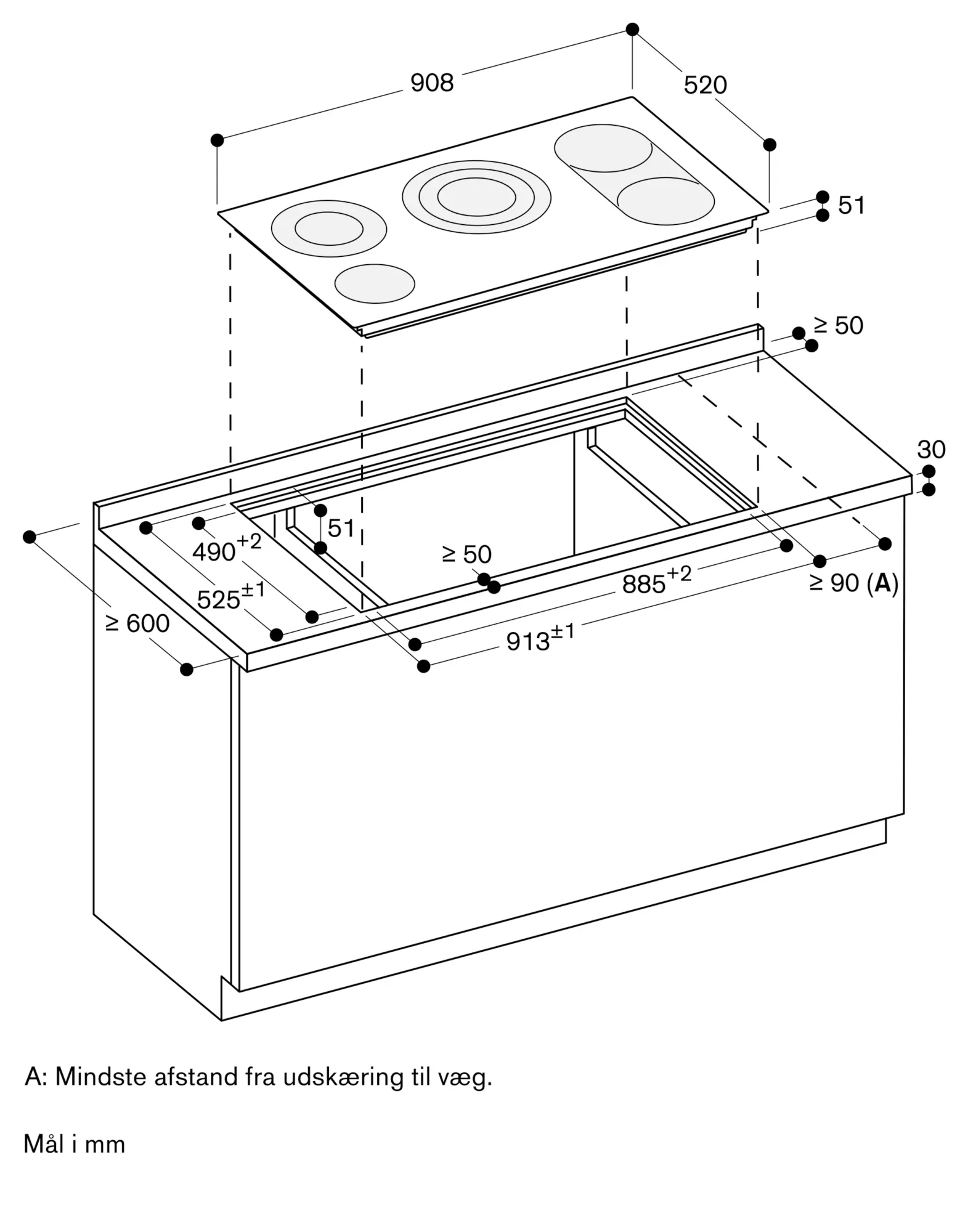 Kogetoppen skal være frit tilgængelig nede fra (bunden af kogetoppen skal kunne fjernes nede fra).