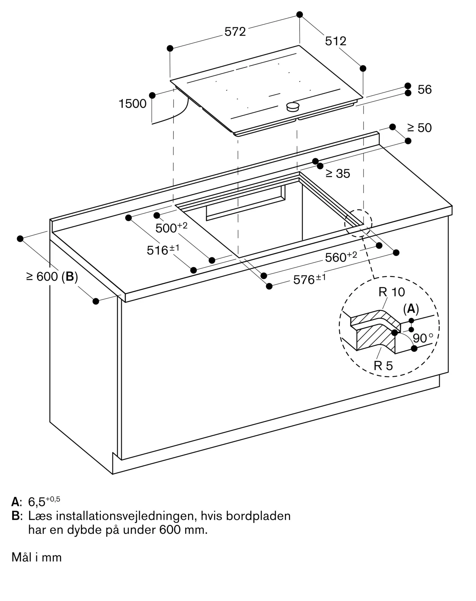 Det er muligt at montere bordplader i sten, syntetisk materiale og massivt træ. Varmebestandighed og tætning af udskæring aftales med bordpladeleverandøren