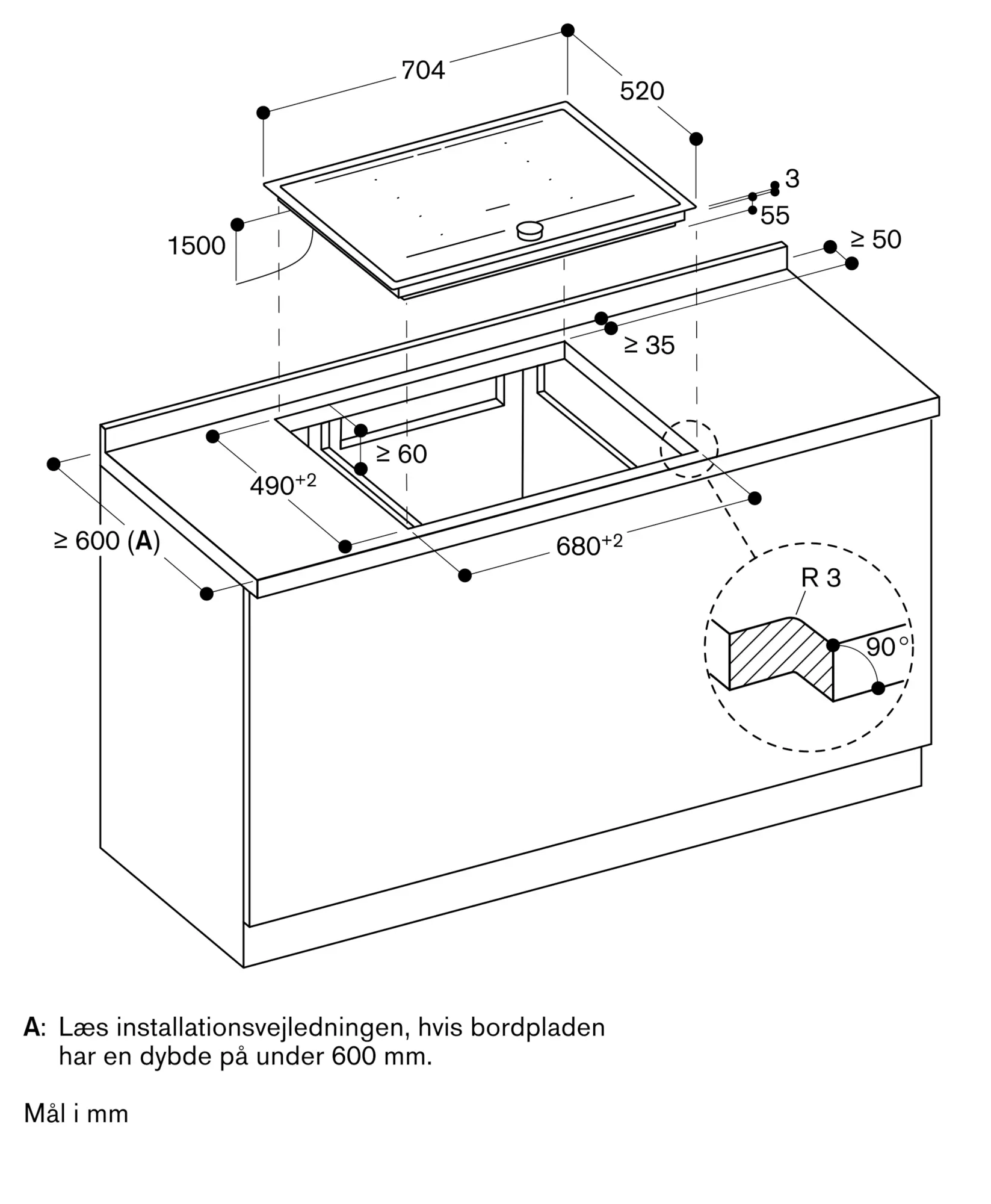 Det er muligt at montere bordplader i sten, syntetisk materiale og massivt træ. Varmebestandighed og tætning af udskæring aftales med bordpladeleverandøren