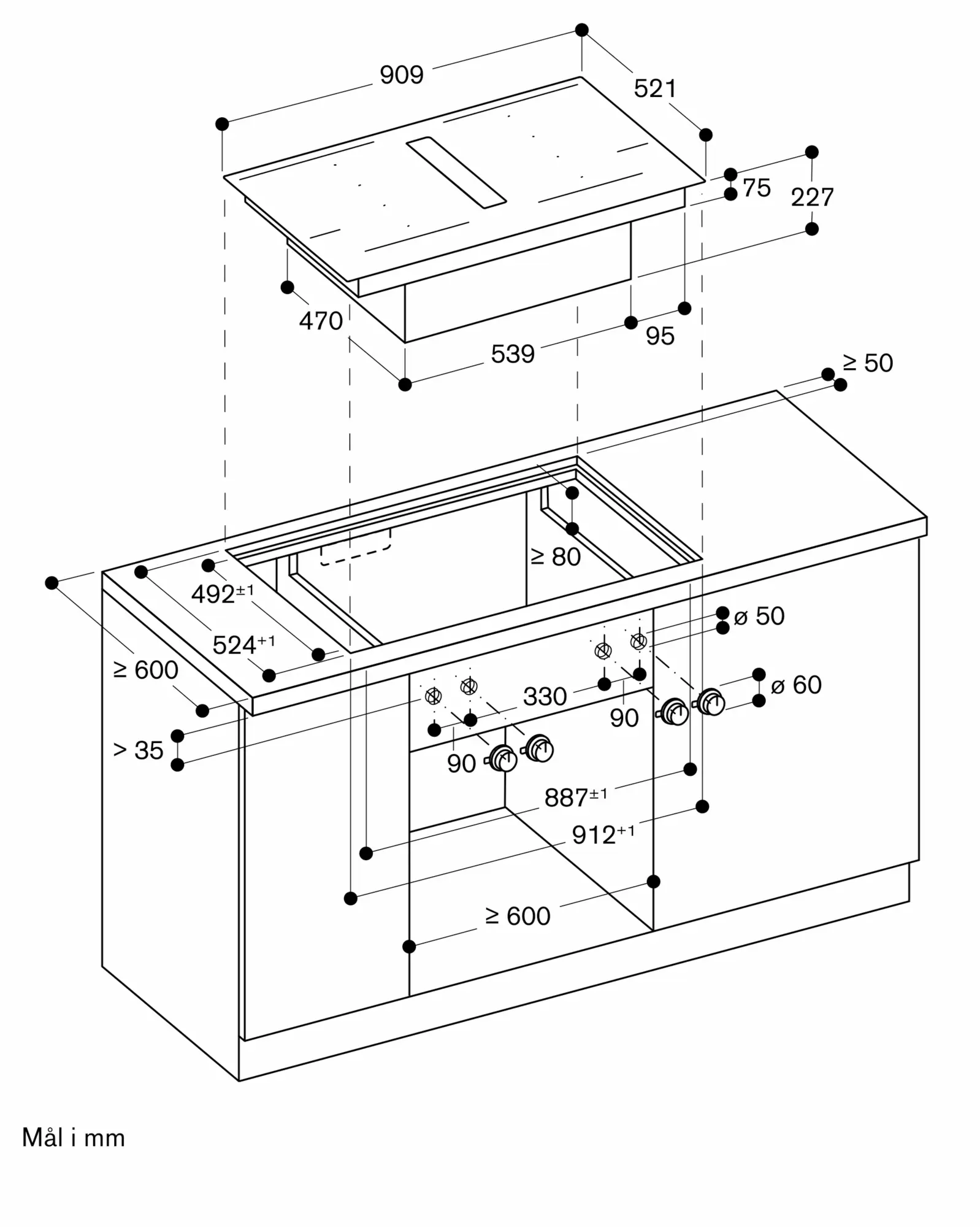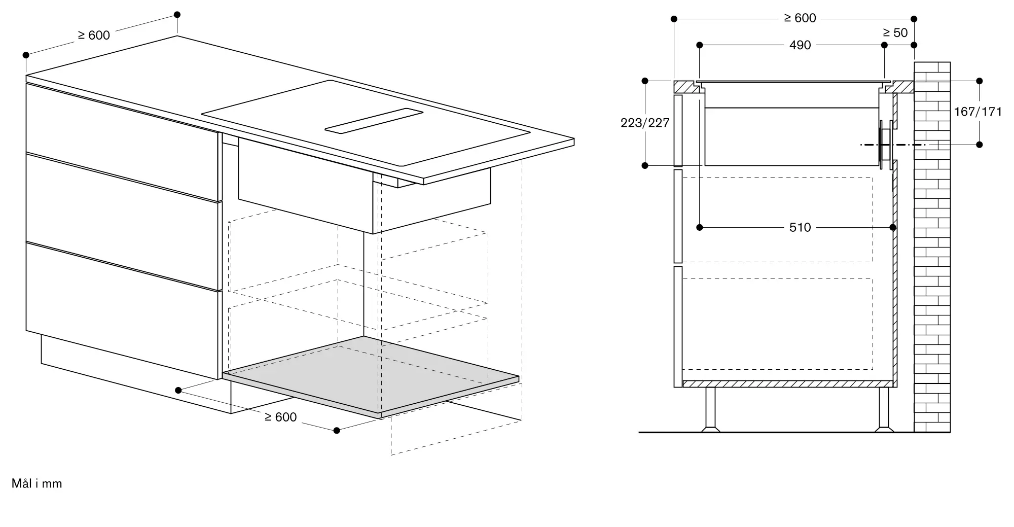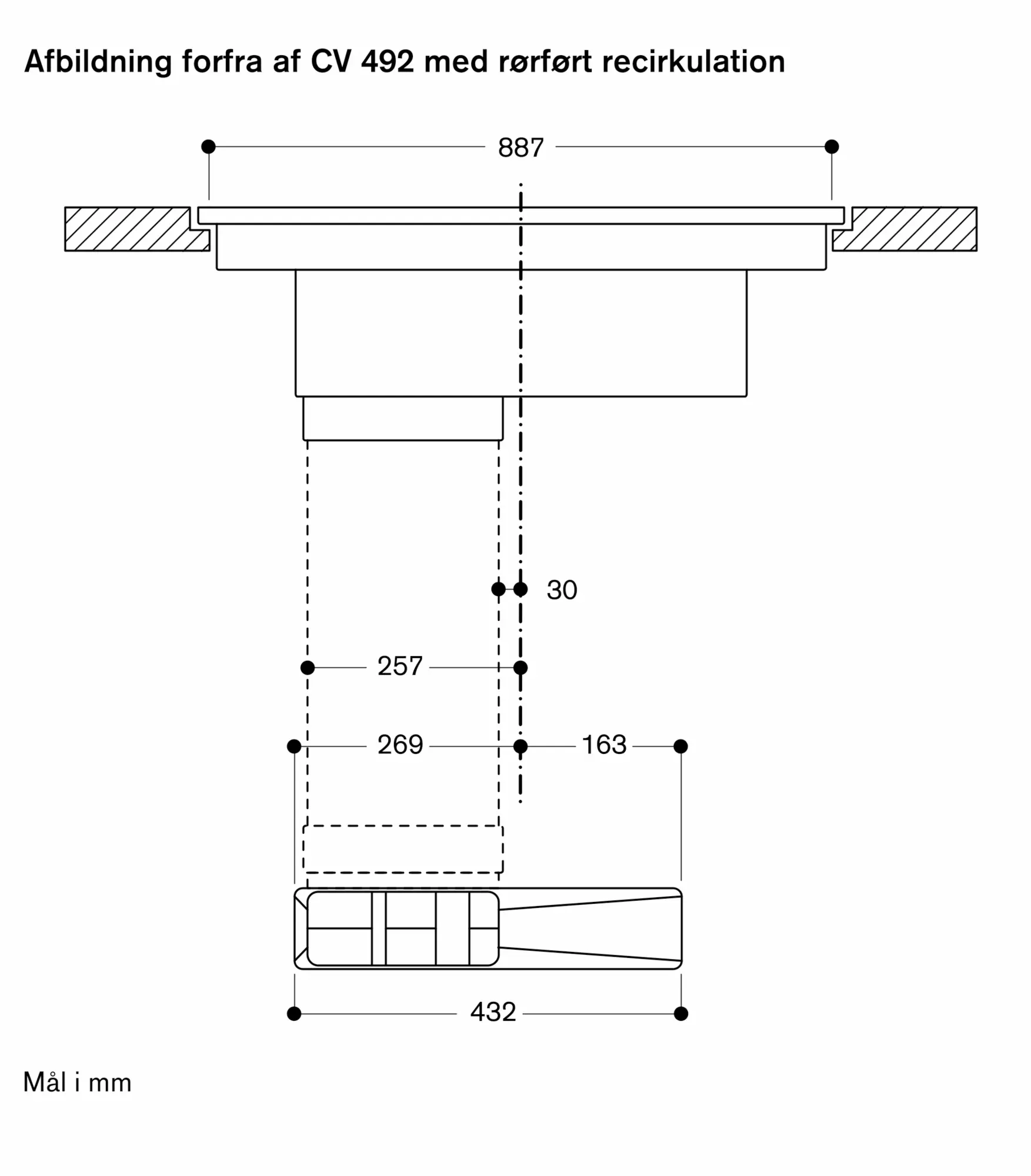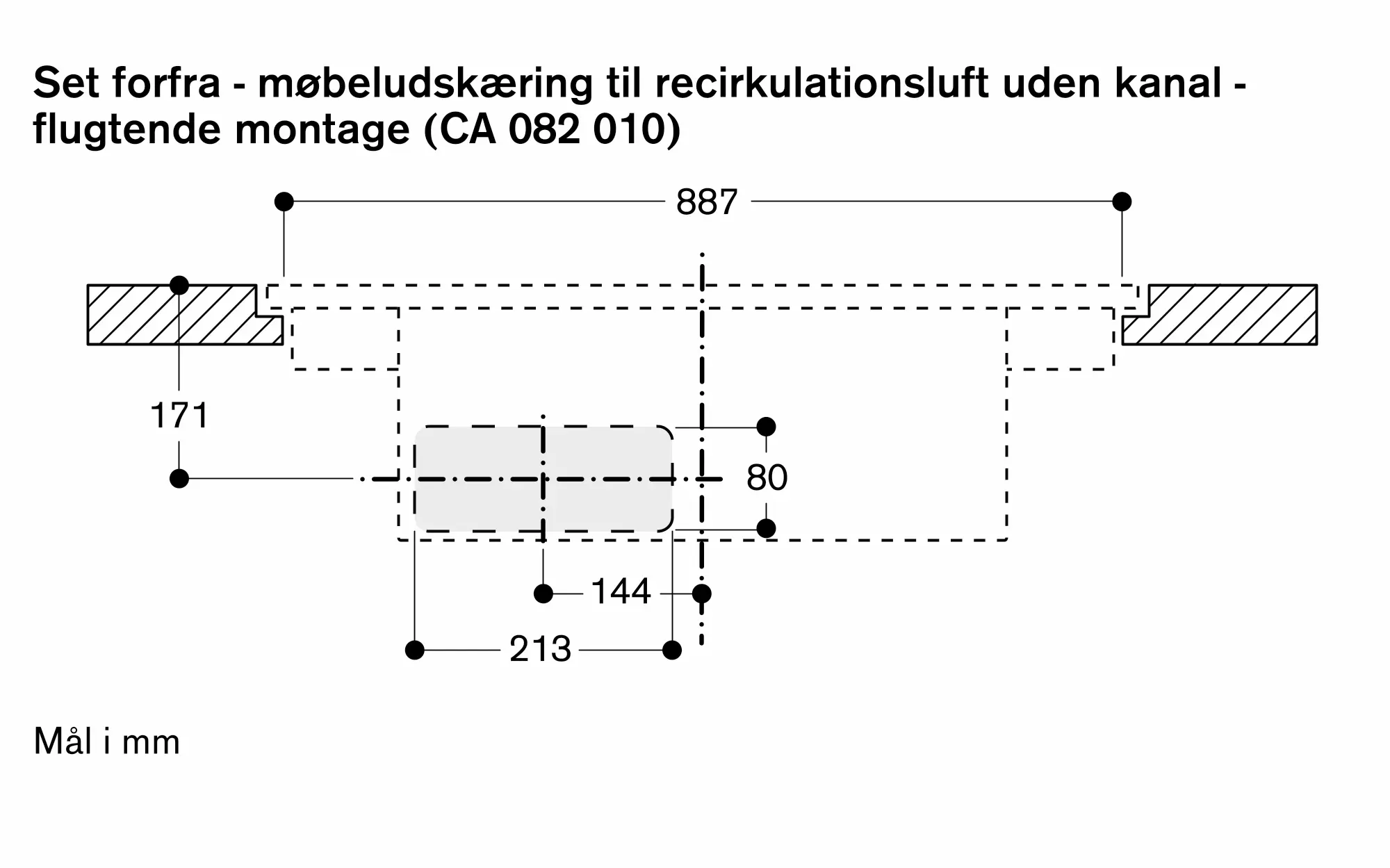 Bordpladedybde: min. 60 cm med ikke-afskærmet recirkulation, min. 65 cm med afskærmet recirkulation/udsugning