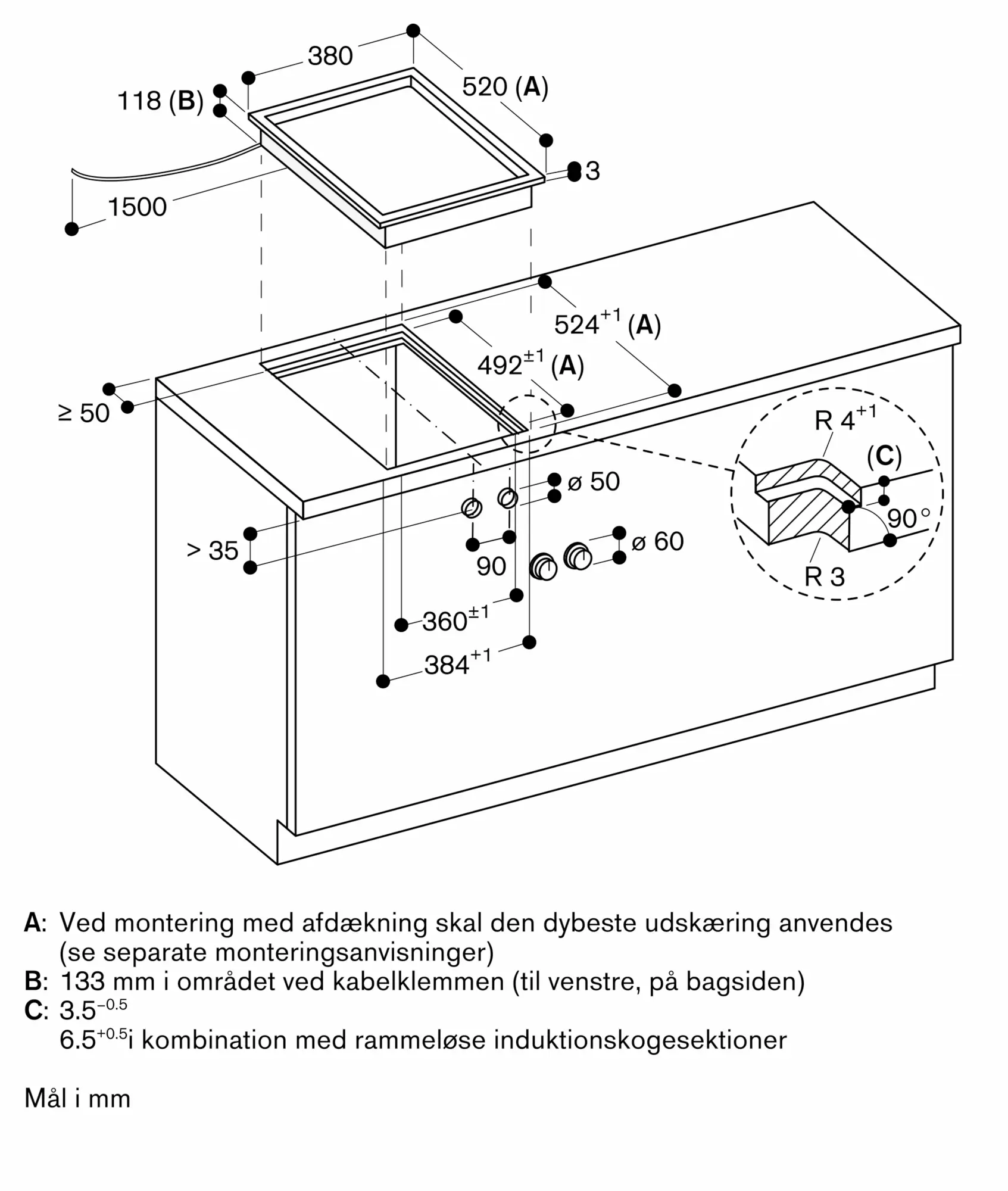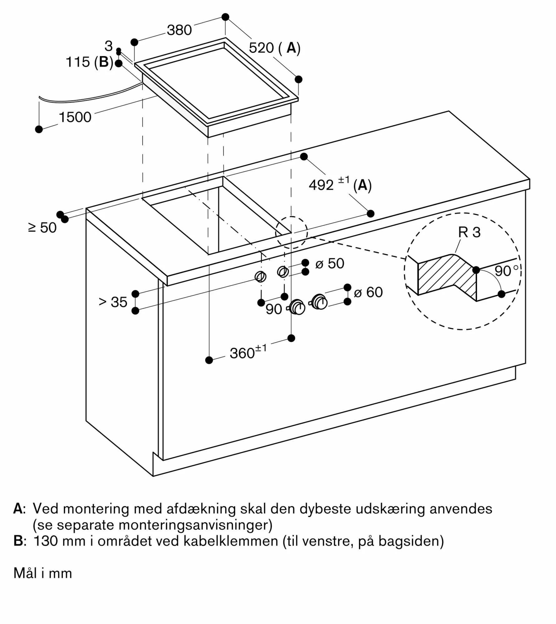 Den samlede bredde kan variere en smule på grund af størrelsestolerancer og udskæringen i bordpladen