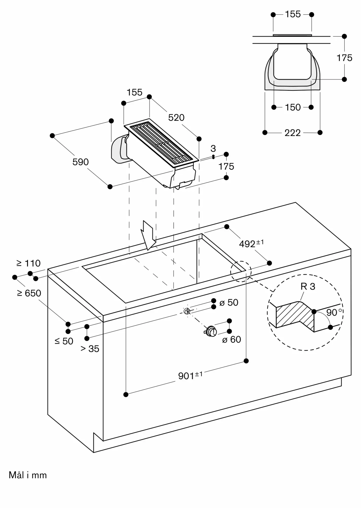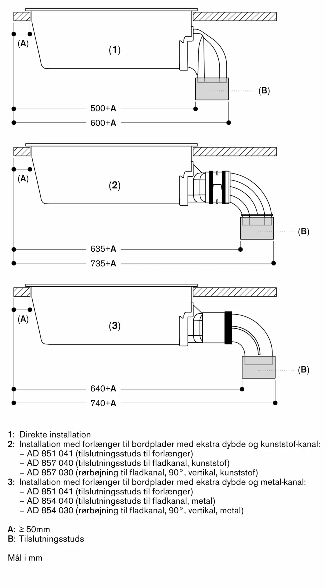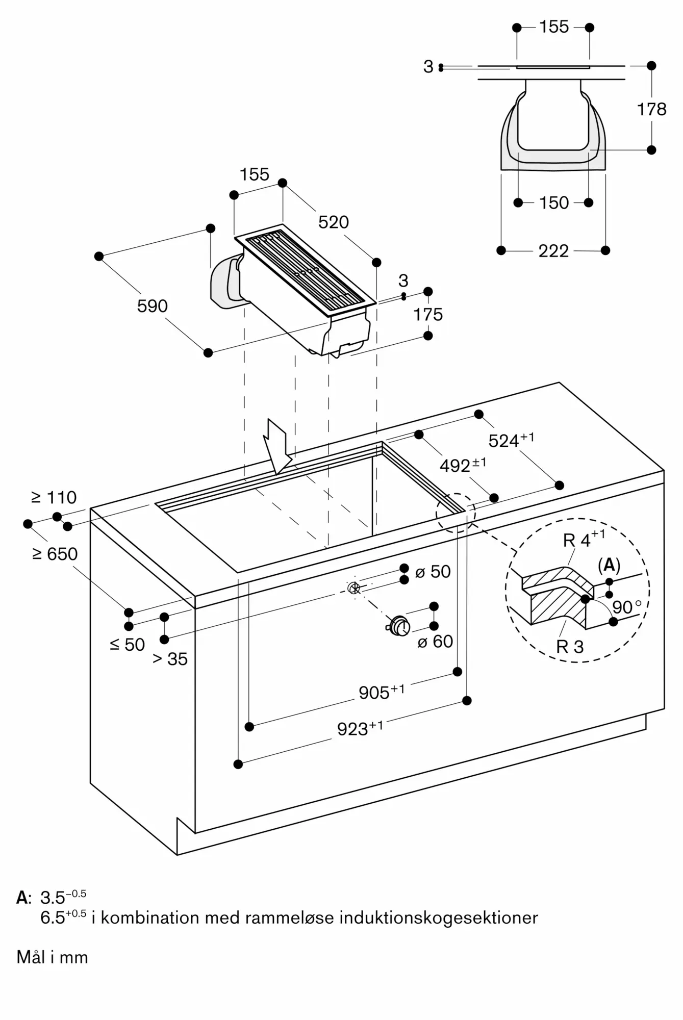 Den samlede bredde kan variere en smule på grund af størrelsestolerancer og udskæringen i bordpladen
