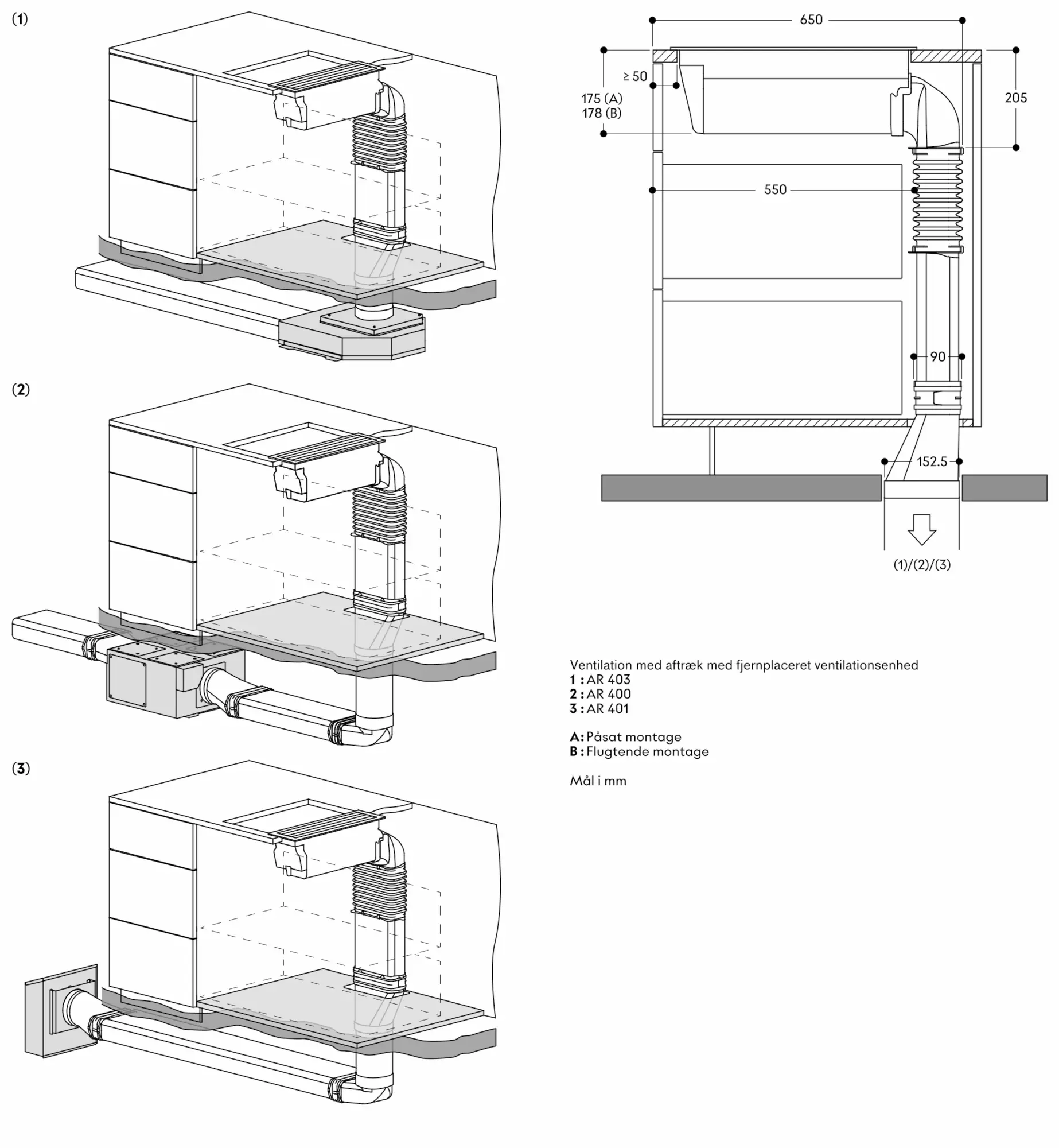 Ved placering ved siden af gaskogetoppe anbefales det at bruge luftskinne AA 414 010 for at sikre kogetoppens optimale ydelse