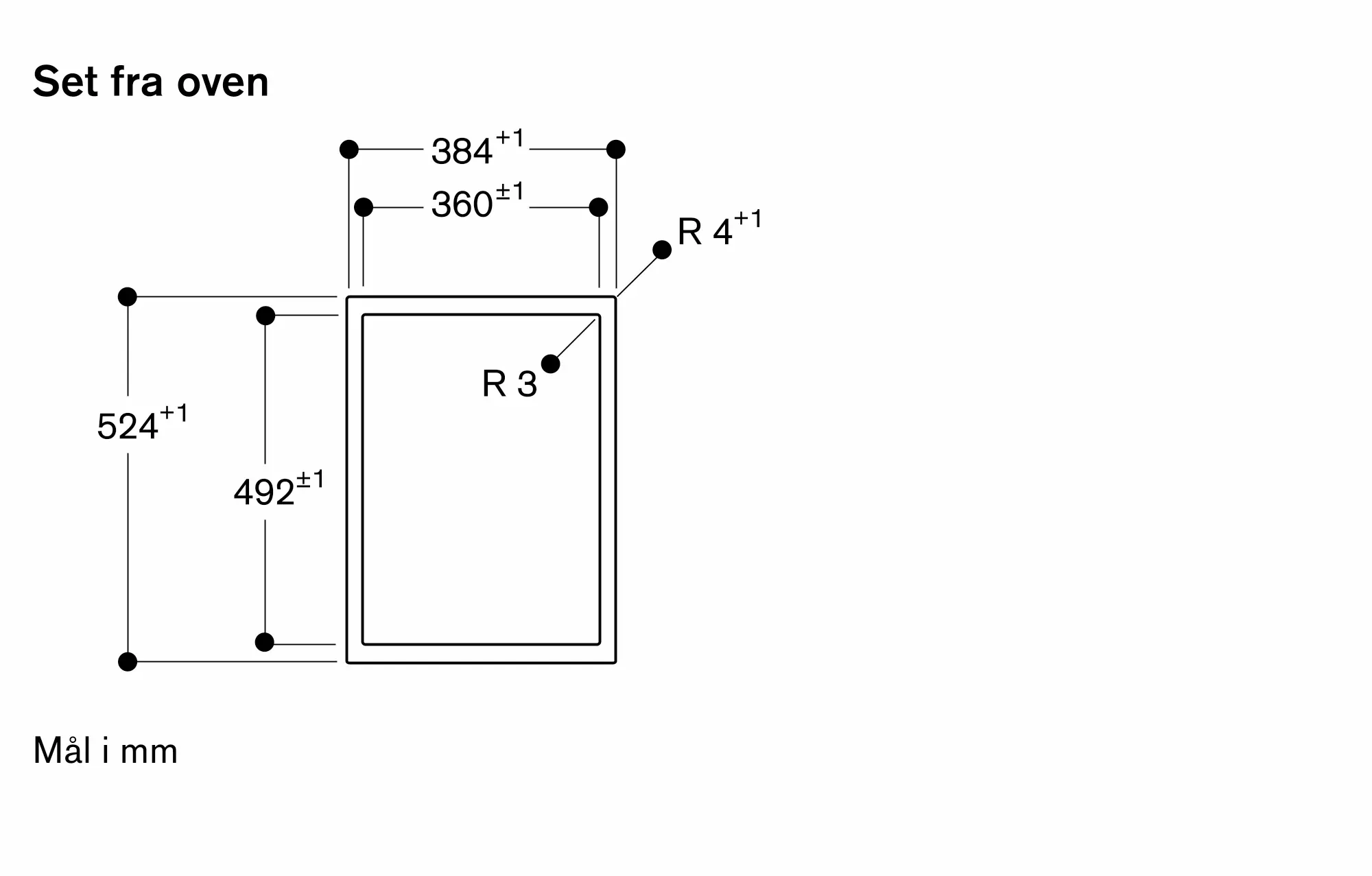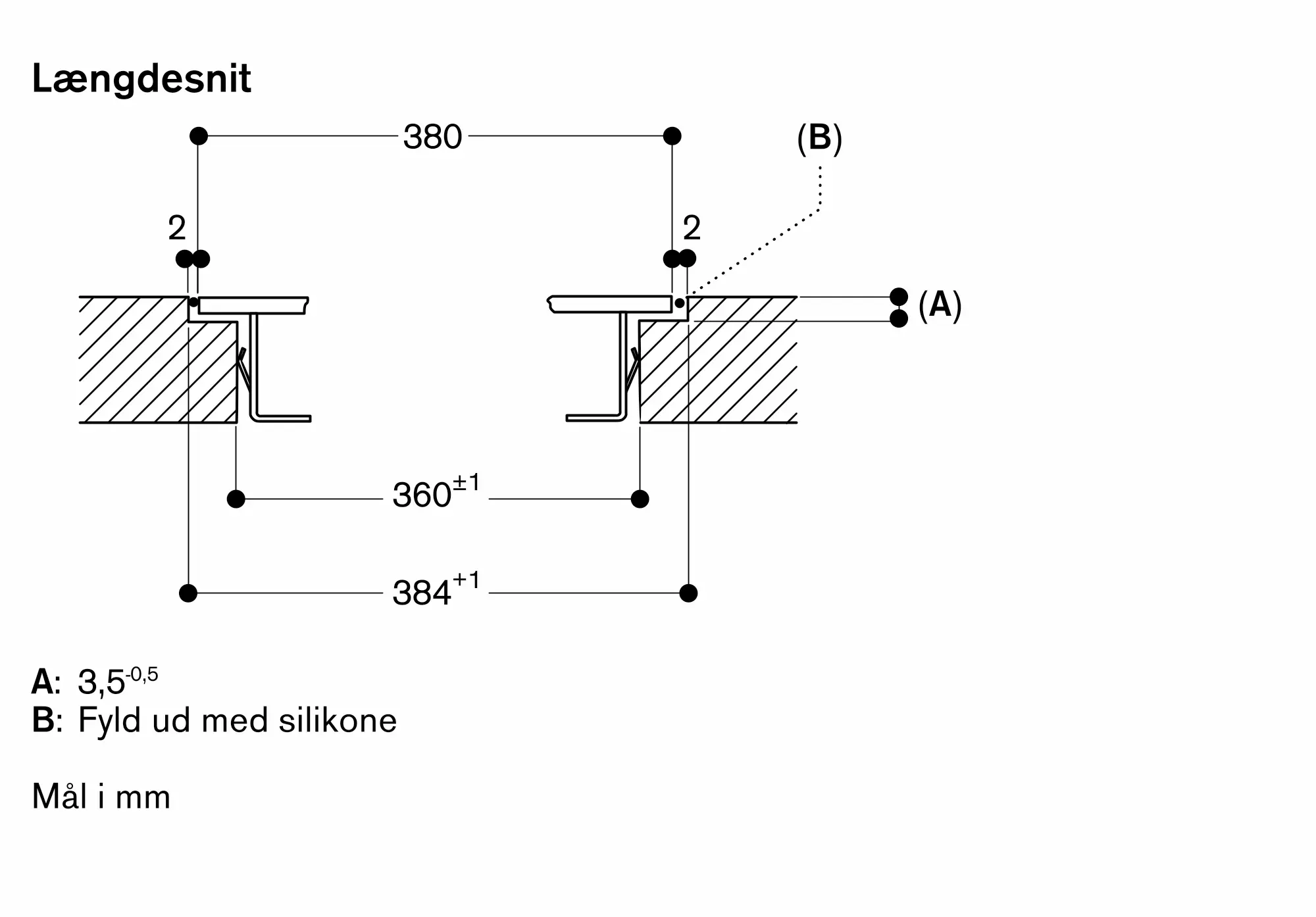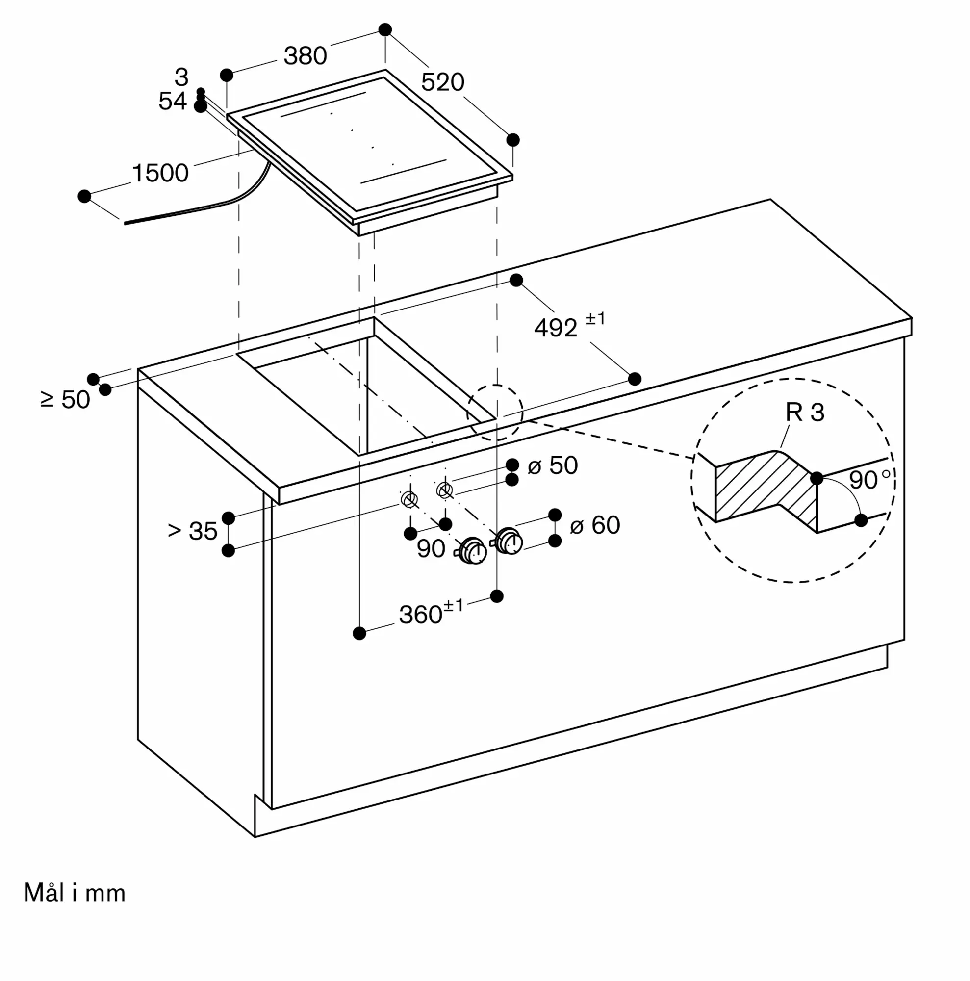Den samlede bredde kan variere en smule på grund af størrelsestolerancer og udskæringen i bordpladen