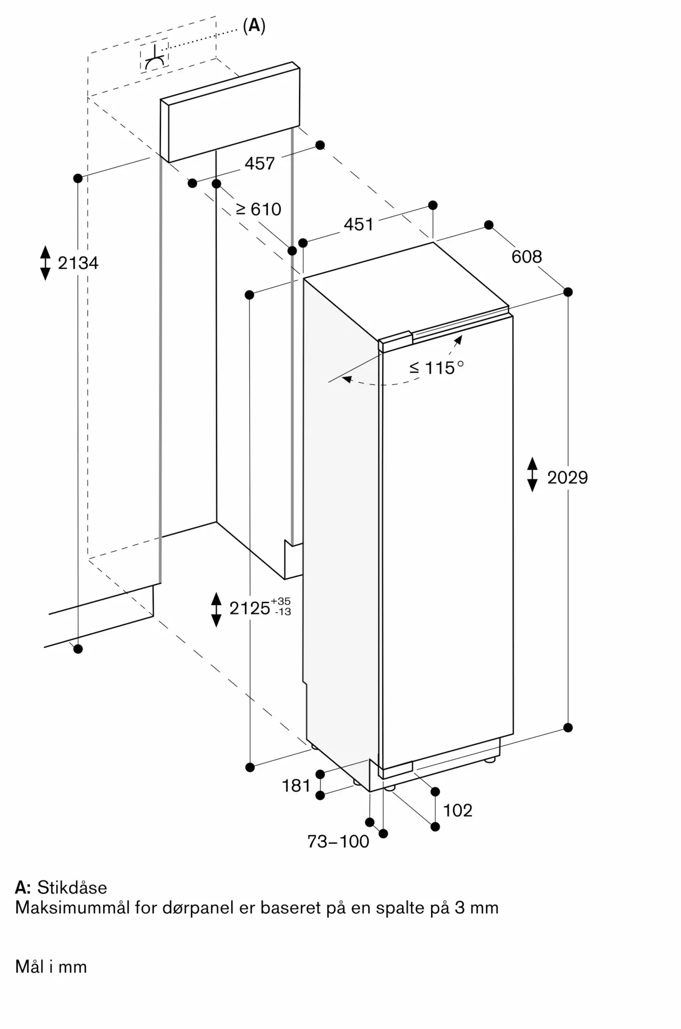 Døråbningsvinkel 115°, kan begrænses til 90°