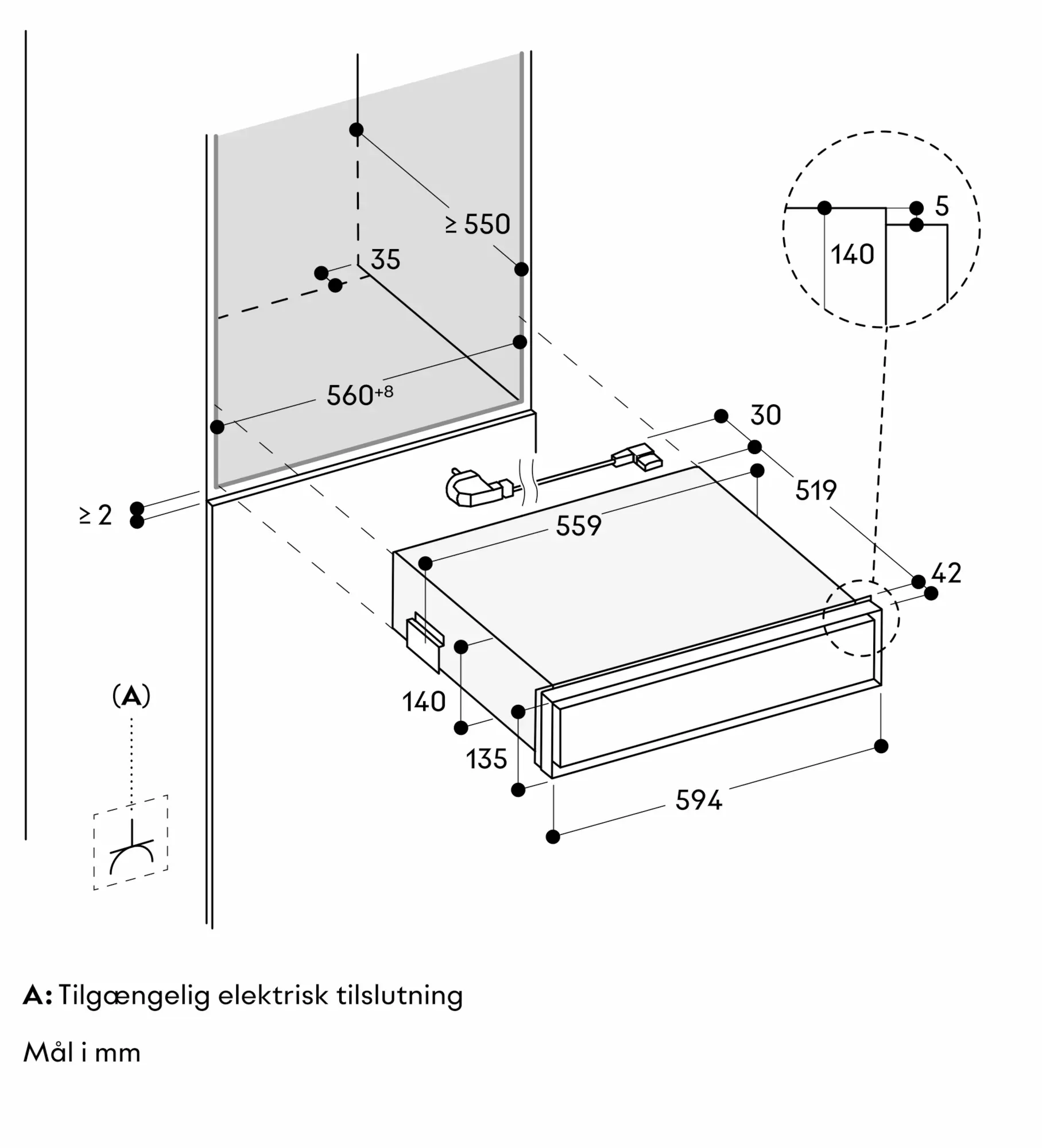 Fremspringet fra apparatets front til møbelskabet er 42 mm.
